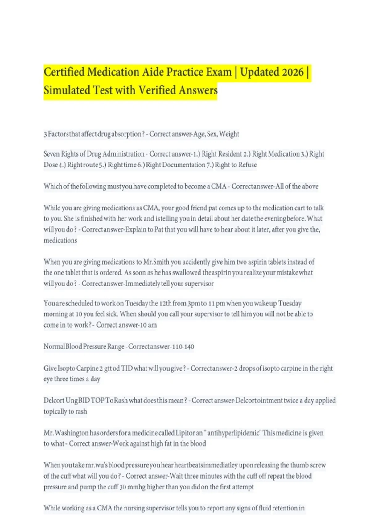 Certified Medication Aide Practice Exam | Updated 2026 | Simulated Test with Verified Answers
