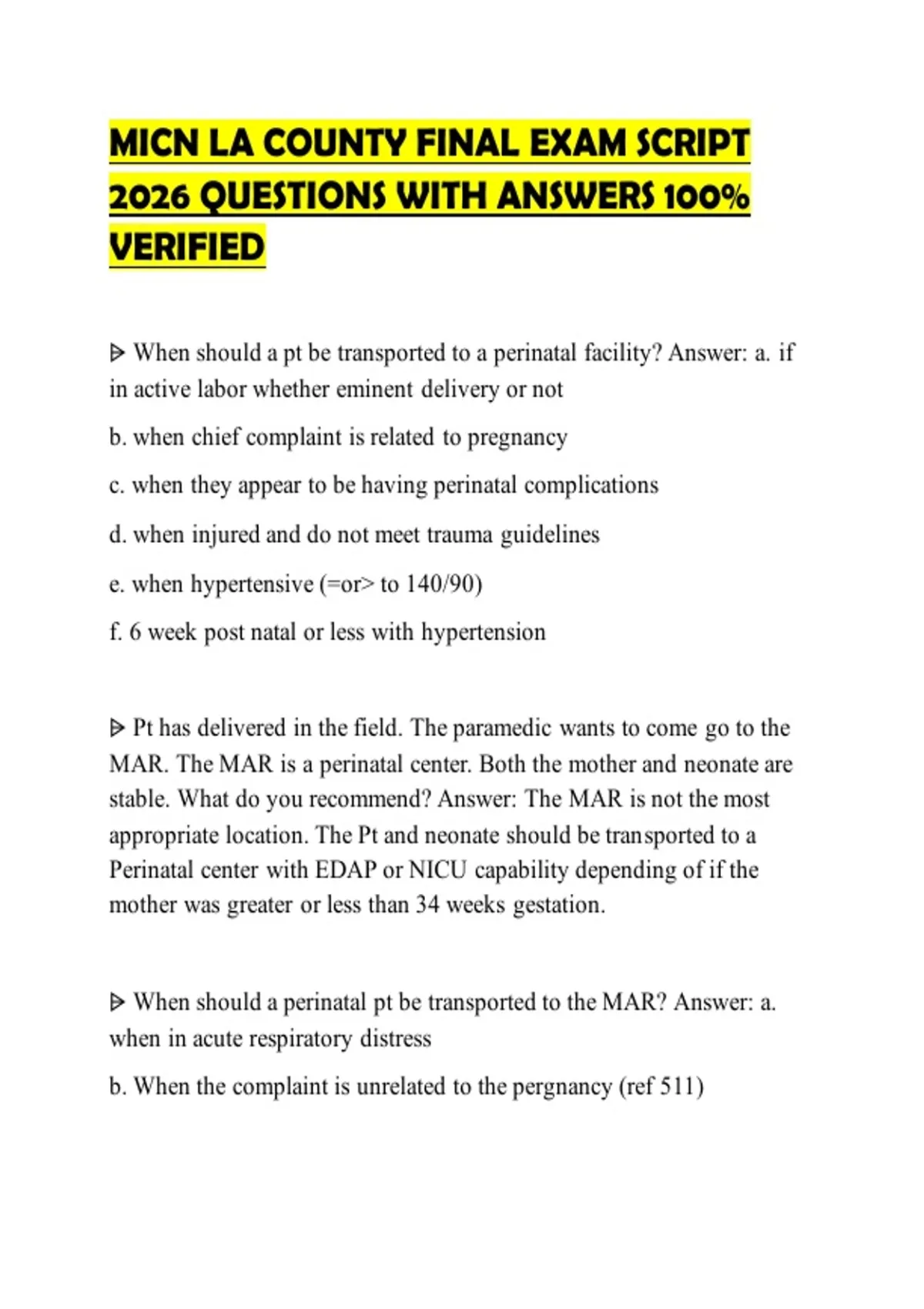 MICN LA COUNTY FINAL EXAM SCRIPT 2026 QUESTIONS WITH ANSWERS 100% VERIFIED