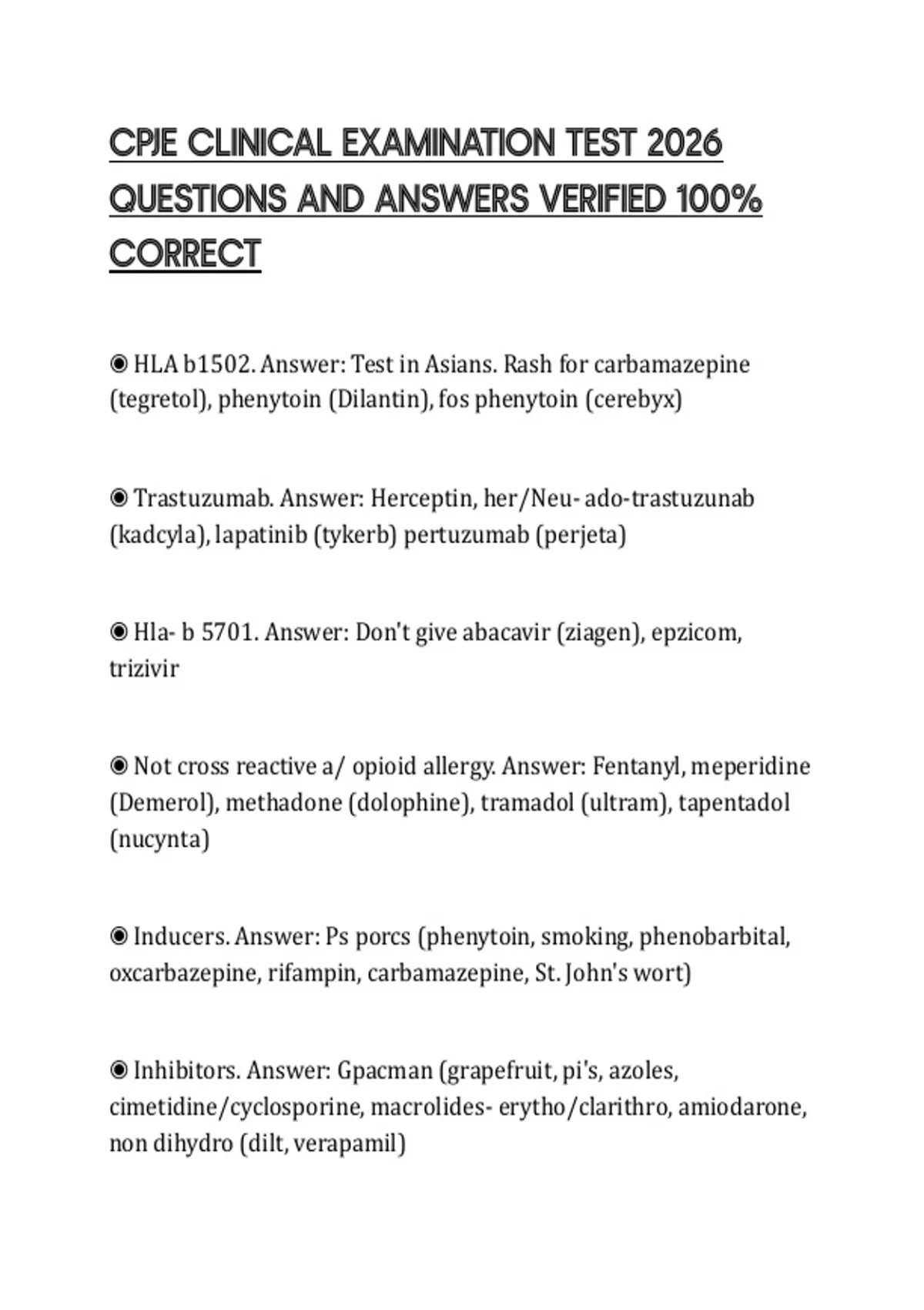 ◉ HLA b1502. Answer: Test in Asians. Rash for carbamazepine