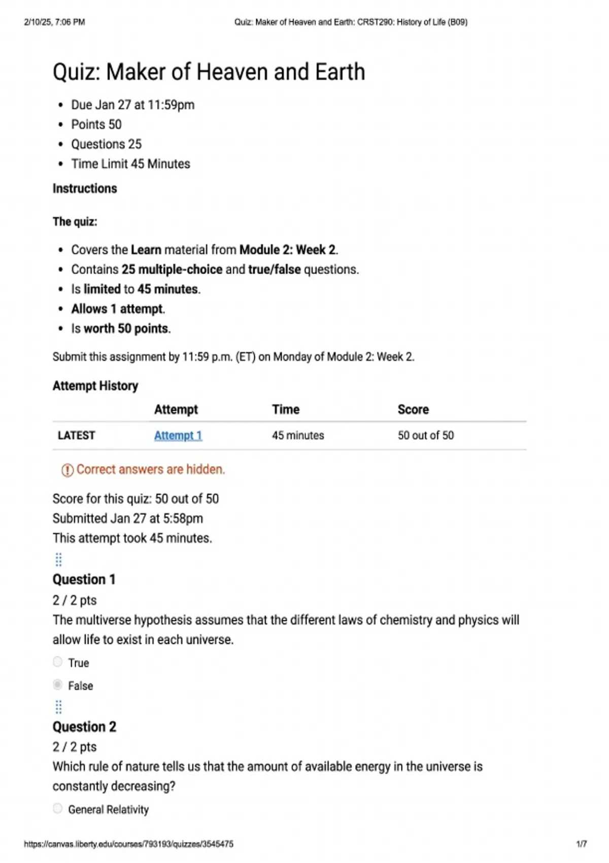 , 2/10/25, 7:06 PM Quiz: Maker of Heaven and Earth: CRST290: History of Life (B09)