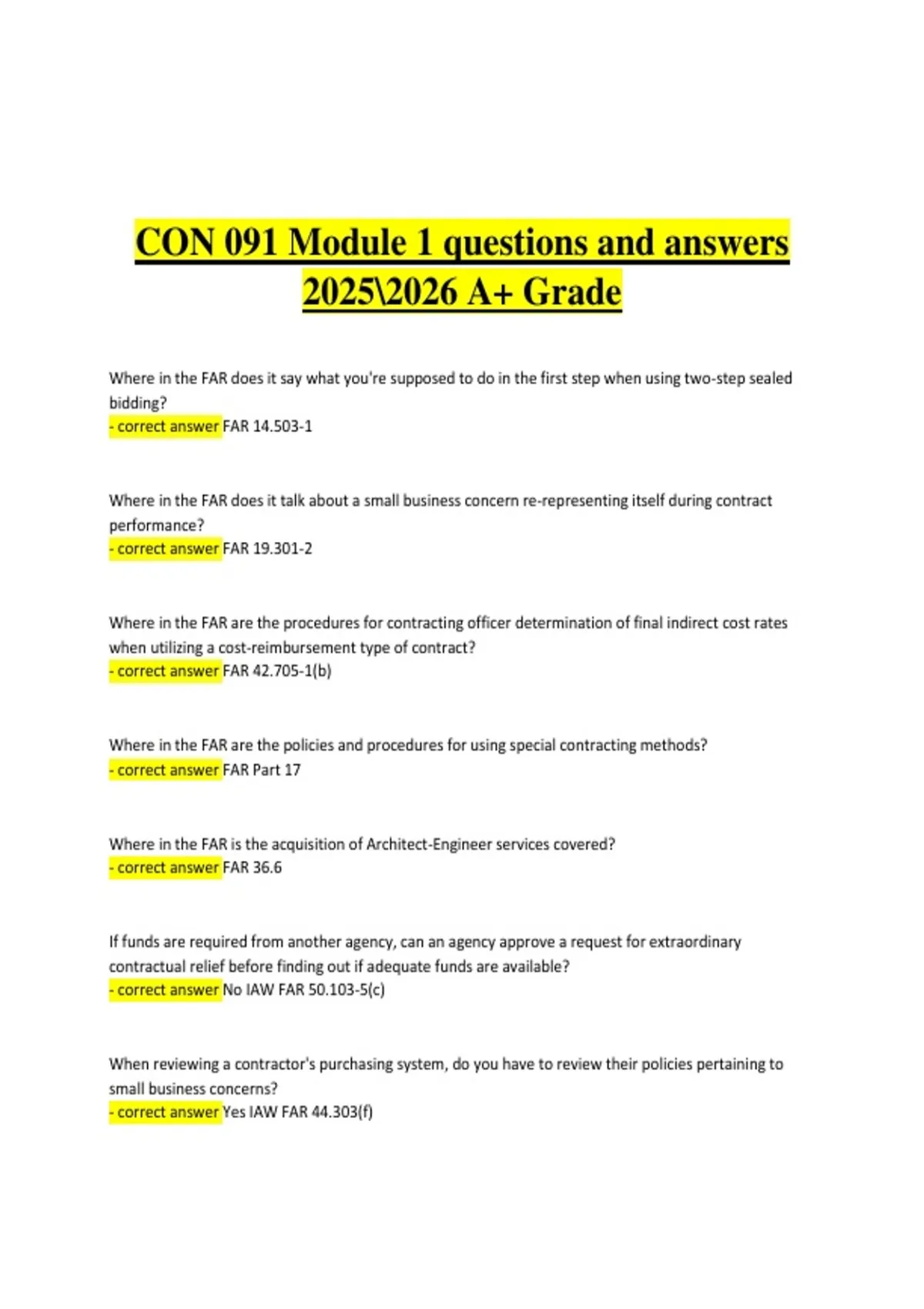 This study guide covers CON 091 Module 1, focusing on foundational federal contracting concepts such as the acquisition environment, roles and responsibilities of the acquisition team, ethics in contracting, basic FAR structure, and the lifecycle of a federal acquisition. It includes module-aligned questions with clear, accurate answers designed to support understanding and successful completion of CON 091 coursework for the 2025–2026 academic period. The material is ideal for new contracting professionals seeking a strong foundation and an A+ grade.