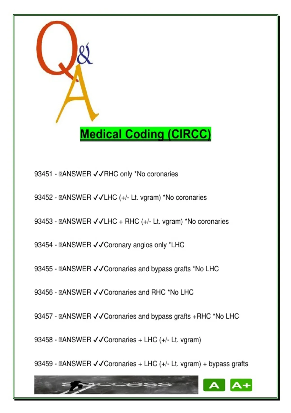 This highly specialized CPT code reference features 30+ interventional cardiology procedure codes used in CIRCC (Certified Interventional Radiology Cardiovascular Coder) practice, focused on cardiac catheterization and angiographic studies. Updated for 2025/2026, this coding list helps cardiovascular coders, cath lab staff, and coding students correctly assign combinations of left/right heart caths (LHC/RHC), coronary angiography, bypass graft visualization, and hemodynamic studies. Key content includes: LHC and RHC combinations: 93451: RHC only 93452: LHC without coronaries 93453: LHC + RHC 93460: LHC + coronaries + RHC Coronary angiography and bypass graft codes: 93454–93459 for coronaries with or without LHC, bypass grafts 93566–93568 for selective right/left ventricle, aortic, and pulmonary angiography Congenital heart caths & selective injections: +93563, +93564, +93565: Used only with congenital studies +93566, +93567, +93568: Add-on codes for cath injections across ventricles, atria, and pulmonary arteries Advanced cath techniques: 93462: Transseptal or transapical puncture 93463–93464: Pharmacologic agent use and exercise-induced hemodynamic measurements RHC variations: 93530–93533 for alternative LHC access techniques (retrograde, transseptal, pre-existing openings) Perfect for: CIRCC-certified coders and those in training Cardiac cath lab coding specialists Medical coding students focusing on interventional radiology or cardiology Instructors building cath procedure training modules Keywords: CIRCC, cardiac catheterization, LHC, RHC, coronary angiography, bypass grafts, CPT codes, congenital heart cath, hemodynamic study, transseptal puncture, pharmacologic testing, pulmonary angiography, aortography, interventional cardiology coding, cath lab codes
