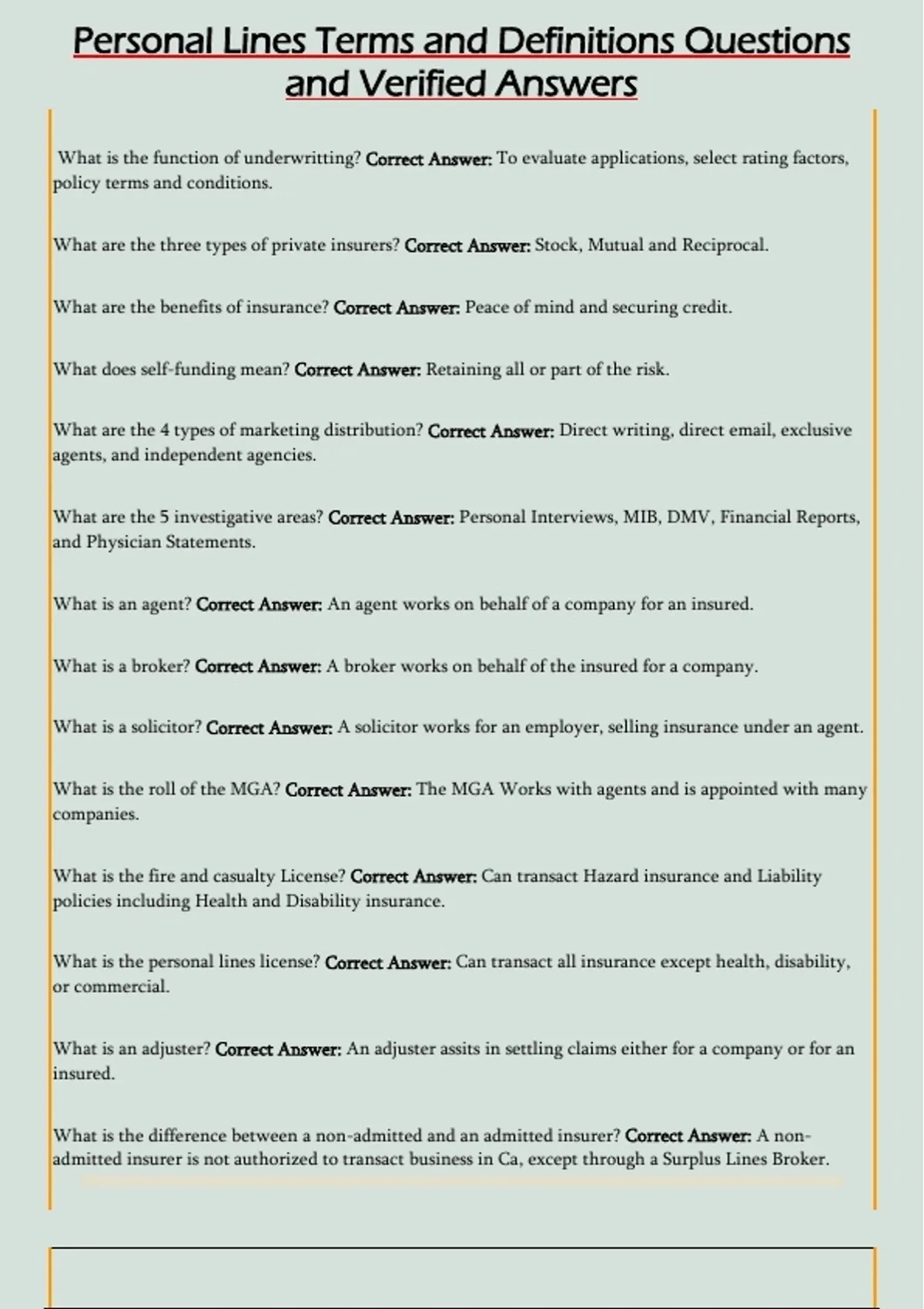 Personal Lines Terms and Definitions Questions and Verified Answers