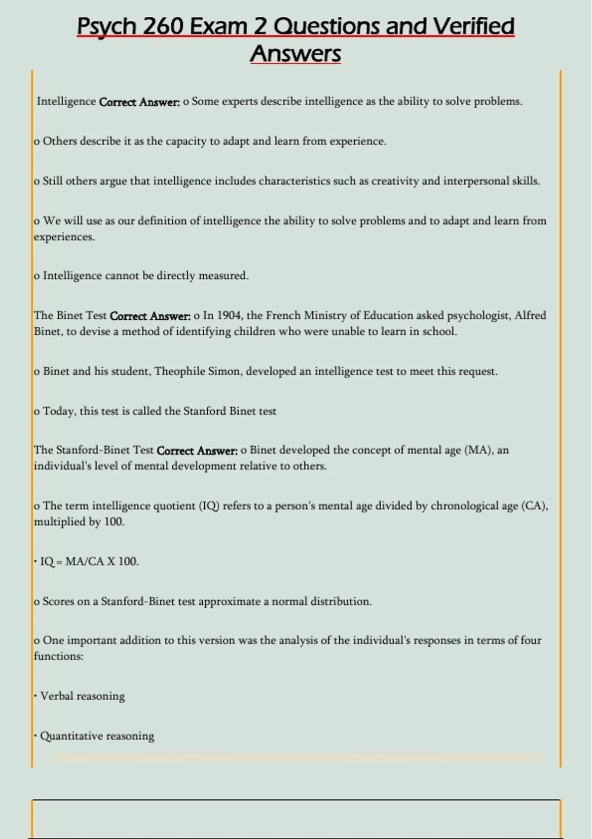 The Stanford-Binet Test Correct Answer: o Binet developed the concept of mental age (MA), an