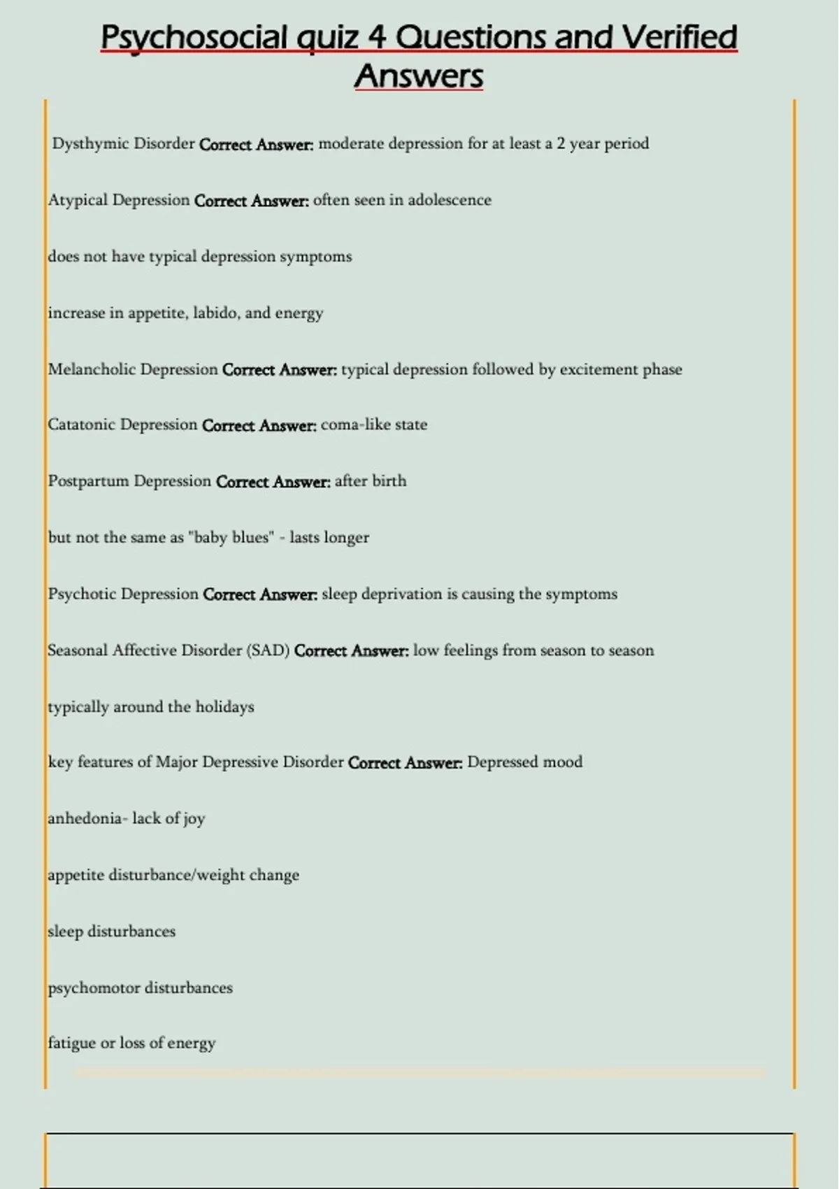 Dysthymic Disorder Correct Answer: moderate depression for at least a 2 year period