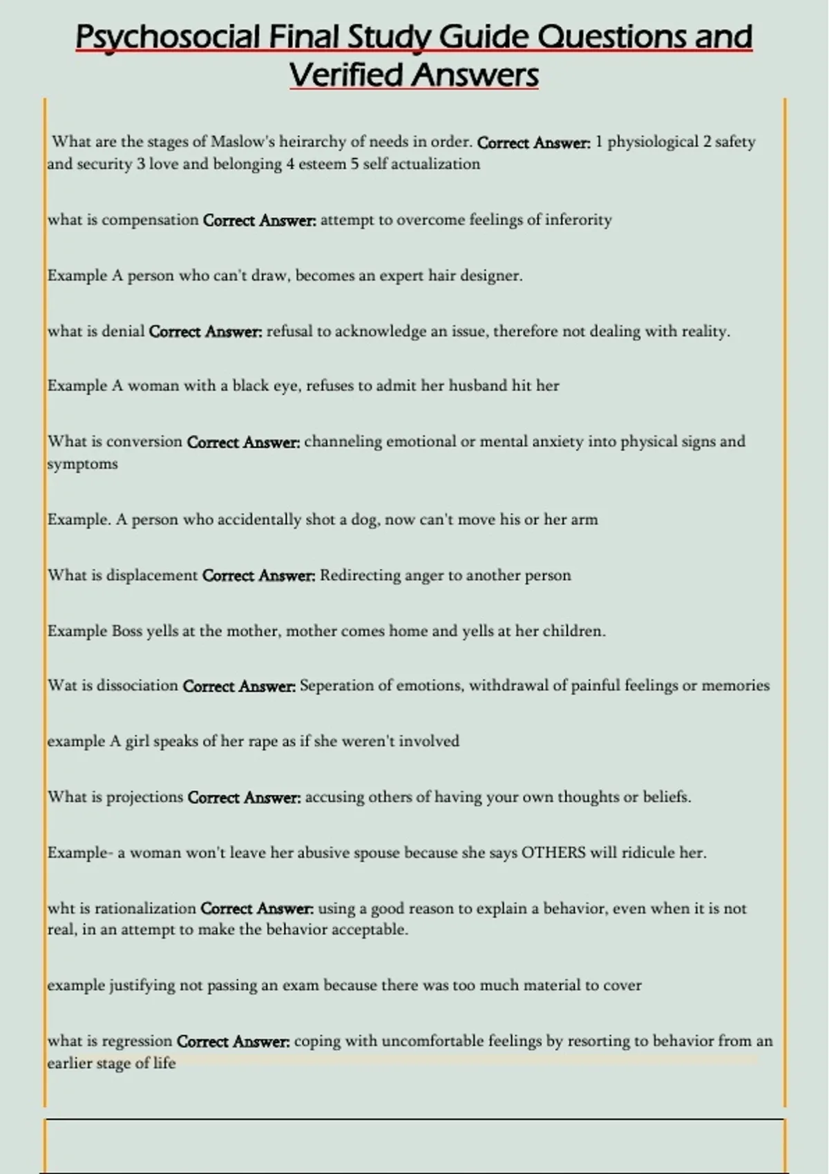 Psychosocial Final Study Guide Questions and Verified Answers