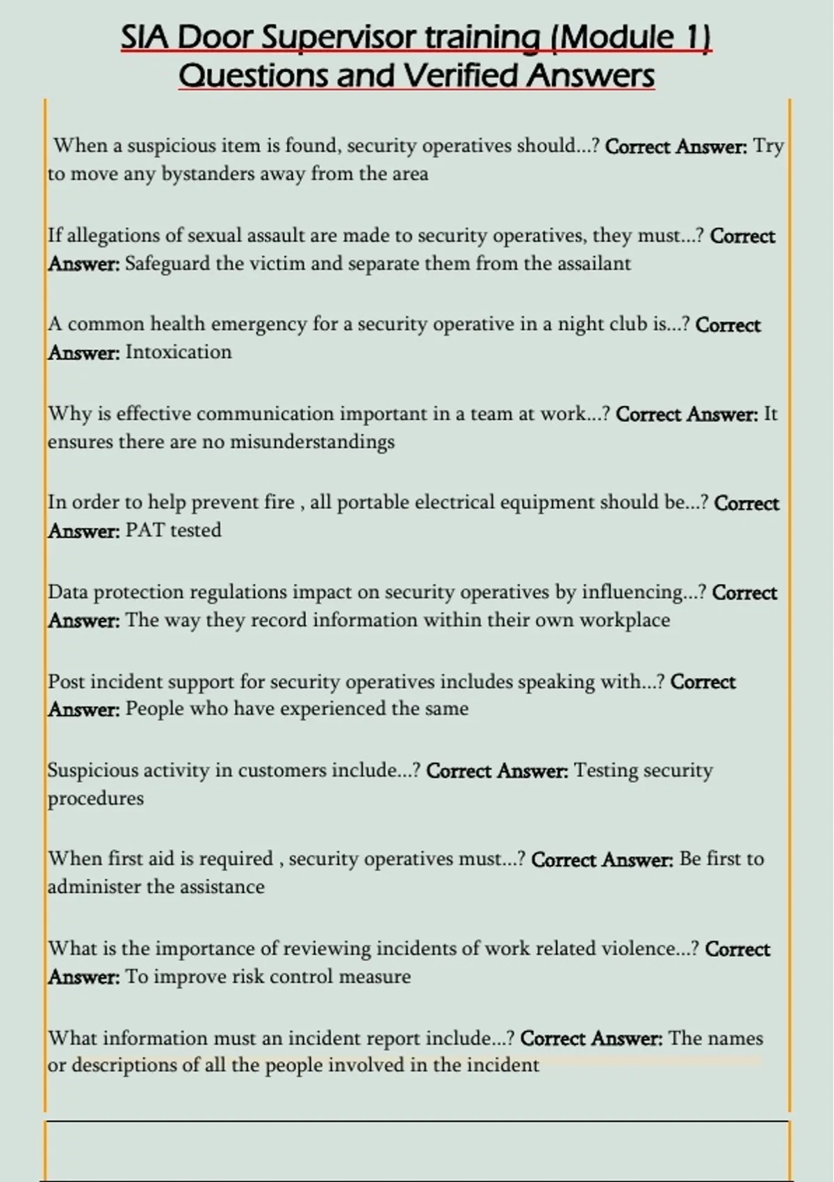 SIA Door Supervisor training (Module 1) Questions and Verified Answers