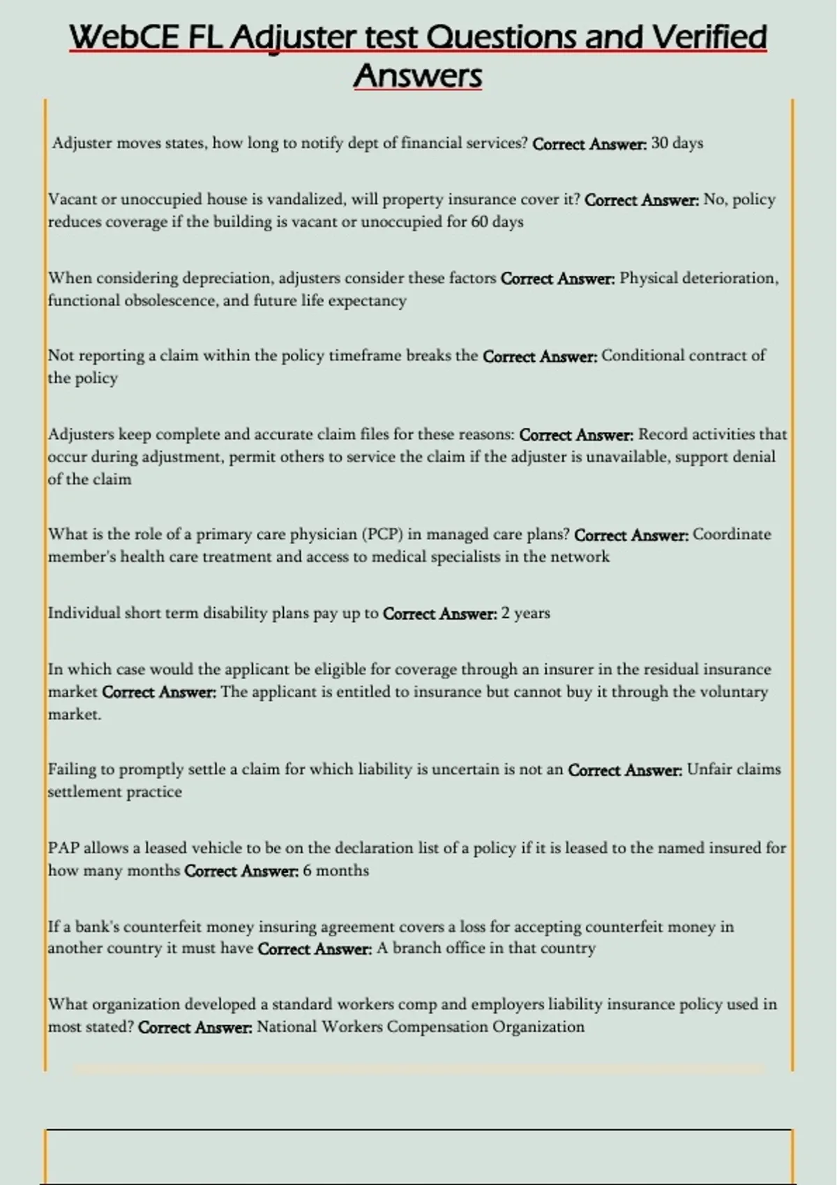 WebCE FL Adjuster test Questions and Verified