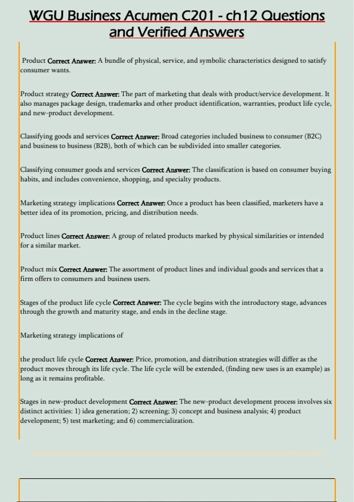 Product strategy Correct Answer: The part of marketing that deals with product/service development. It