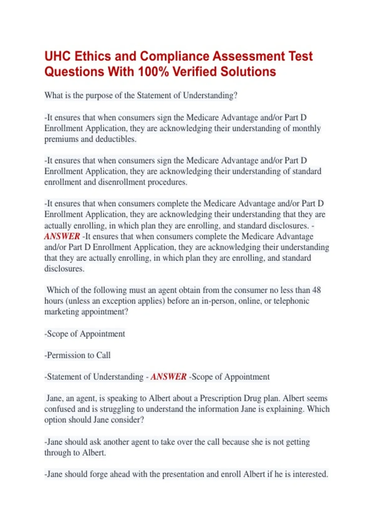 UHC Ethics and Compliance Assessment Test Questions With 100% Verified Solutions What is the purpose of the Statement of Understanding? -It ensures that when consumers sign the Medicare Advantage and/or Part D Enrollment Application, they are acknowledging their understanding of monthly premiums and deductibles. -It ensures that when consumers sign the Medicare Advantage and/or Part D Enrollment Application, they are acknowledging their understanding of standard enrollment and disenrollment procedures. -It ensures that when consumers complete the Medicare Advantage and/or Part D Enrollment Application, they are acknowledging their understanding that they are actually enrolling, in which plan they are enrolling, and standard disclosures. - ANSWER -It ensures that when consumers complete the Medicare Advantage and/or Part D Enrollment Application, they are acknowledging their understanding that they are actually enrolling, in which plan they are enrolling, and standard disclosures. Which of the following must an agent obtain from the consumer no less than 48 hours (unless an exception applies) before an in-person, online, or telephonic marketing appointment? -Scope of Appointment -Permission to Call -Statement of Understanding - ANSWER -Scope of Appointment Jane, an agent, is speaking to Albert about a Prescription Drug plan. Albert seems confused and is struggling to understand the information Jane is explaining. Which option should Jane consider? -Jane should ask another agent to take over the call because she is not getting through to Albert. -Jane should forge ahead with the presentation and enroll Albert if he is interested. -Jane should ask Albert if someone, such as an Authorized Legal Representative, helps him make health care or insurance-related decisions and should be present. -Jane should tell Albert to find the information on the plan's website. - ANSWER Jane should ask Albert if someone, such as an Authorized Legal Representative, helps him make health care or insurance-related decisions and should be present. Select the option that describes the coverage combinations a member can be enrolled in at the same time. -Medicare Supplement plan and MA-PD plan -MA-Only PFFS plan and a stand-alone PDP -MA-Only non-PFFS plan and a stand-alone PDP - ANSWER -MA-Only PFFS plan and a stand-alone PDP In which situation MAY the Medicare Advantage (MA) organization decide to disenroll a member from an MA plan? -Premiums are not paid on a timely basis -The member expresses dissatisfaction with the plan -The member is diagnosed with a condition - ANSWER -Premiums are not paid on a timely basis Dennis, a consumer, is currently enrolled in Original Medicare plus a Medicare Supplement Plan. His current plan is suitable for his medical needs, but he would like to add prescription drug coverage only. Since Dennis wants to keep his current coverage, which option is available to Dennis (assuming he is in a valid election period)? -Dennis should disenroll from his Medicare Supplement Plan, return to Original Medicare and enroll in a stand-alone PDP. -Dennis should disenroll from his Medicare Supplement Plan and enroll in any of the Medicare Advantage Plans that have prescription drug coverage included. -Dennis should stay enrolled in his Medicare Supplement Plan and enroll in a Medicare Advantage Plan with prescription drug coverage included. -Dennis should stay enrolled in Original Medicare and his Medicare Supplement Plan and enroll in a stand-alone PDP. - ANSWER -Dennis should stay enrolled in Original Medicare and his Medicare Supplement Plan and enroll in a stand-alone PDP. In what product should agents enroll consumers? -A product that meets the sales goal of the Centers for Medicare and Medicaid Services, UnitedHealthcare and the Social Security Administration. -A product that meets the interest the agent has in the transaction, for example commissions received for the sale. -A product that is suitable for the consumer's needs, goals and financial resources. -A product that provides a financial advantage to a network of providers. - ANSWER -A product that is suitable for the consumer's needs, goals and financial resources. To avoid confusing or misleading a consumer, what type of information must the agent provide when presenting a plan? (Select 3) -Unsubstantiated -Complete -Factual -Accurate - ANSWER -Complete Factual Accurate