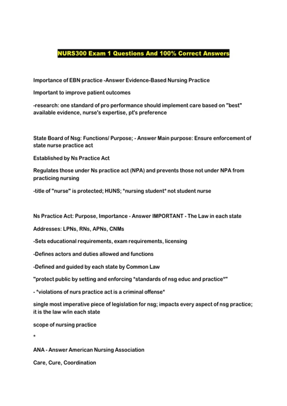 This document includes a focused set of NURS300 Exam 1 questions with 100% correct answers, covering the foundational concepts assessed in the first exam. Topics typically include nursing fundamentals, patient safety, basic clinical skills, professional roles, and core theoretical principles, making it ideal for targeted exam preparation and revision.