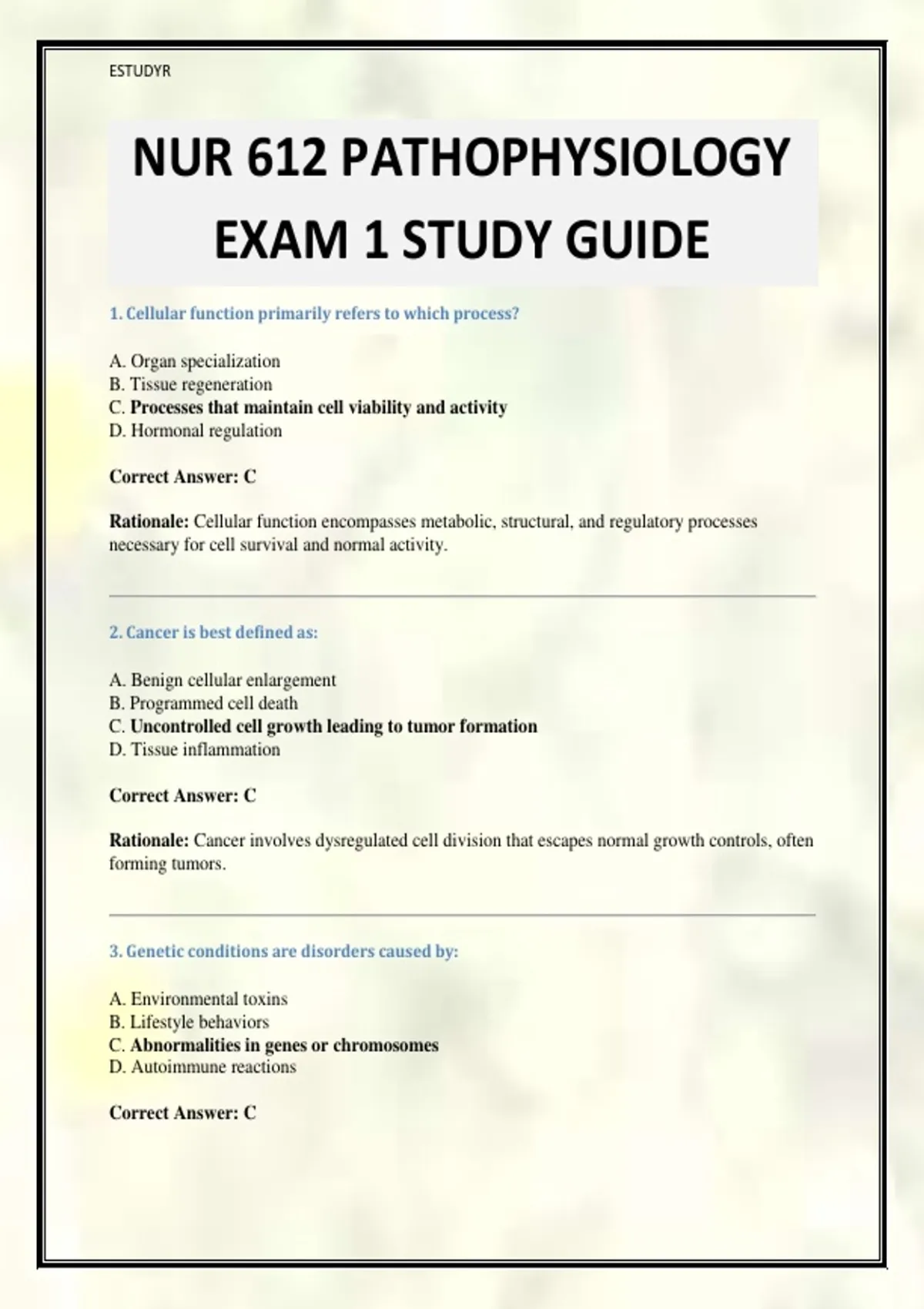 NUR 612 PATHOPHYSIOLOGY EXAM 1 STUDY GUIDE