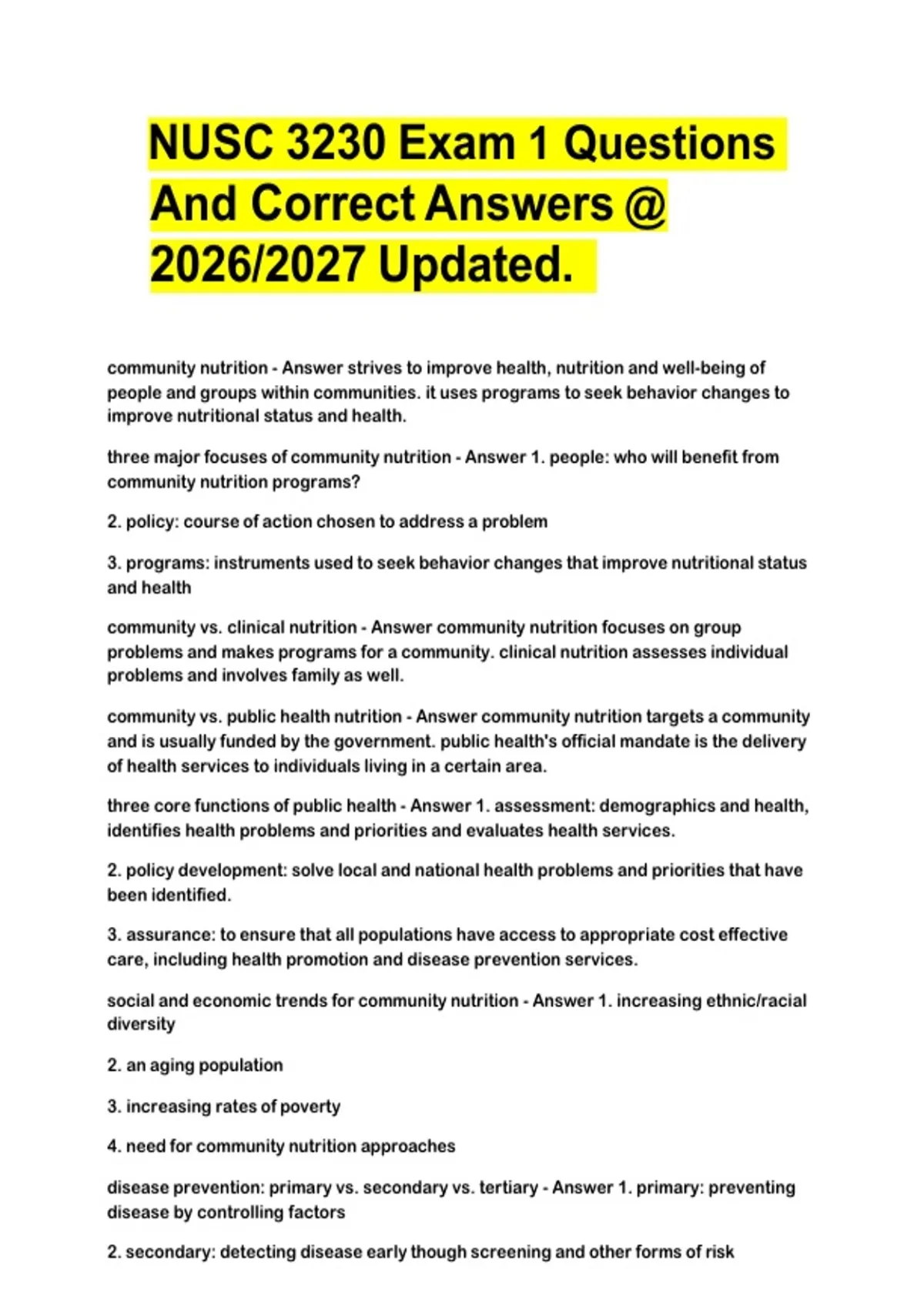 This document contains updated NUSC 3230 Exam 1 questions with correct, verified answers for the 2026/2027 academic year. It covers key nutrition science topics commonly assessed in Exam 1, making it ideal for focused revision, exam preparation, and concept reinforcement.