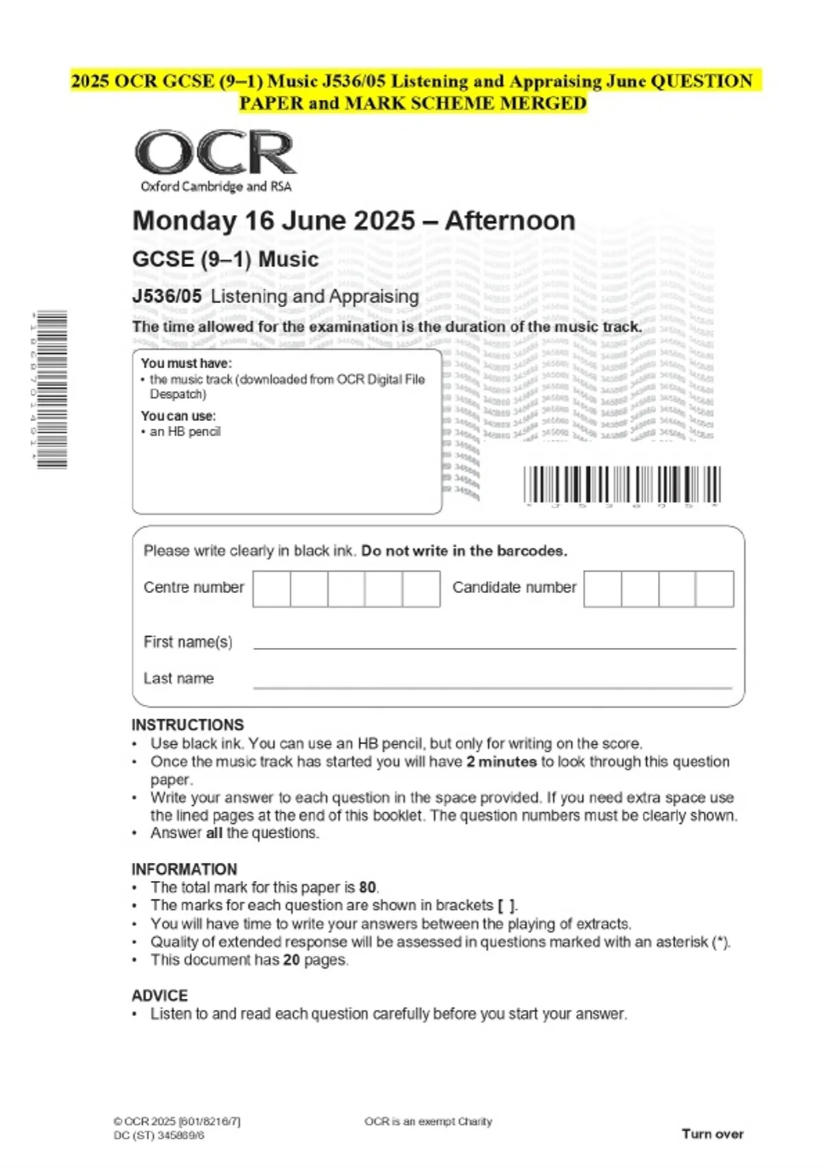 2025 OCR GCSE (9–1) Music J536/05 Listening and Appraising June QUESTION PAPER and MARK SCHEME MERGED