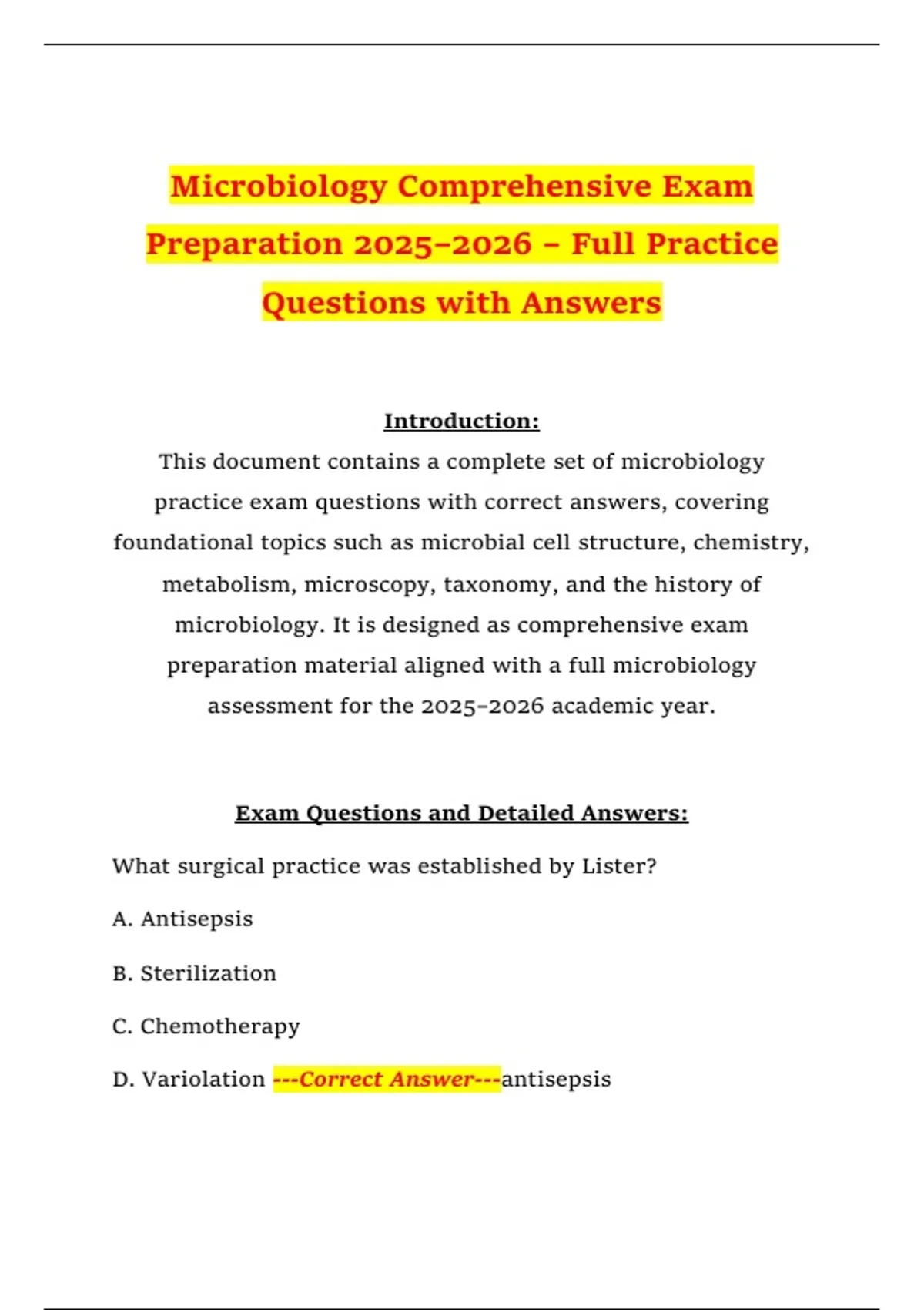 Microbiology Comprehensive Exam Preparation 2025–2026 – Full Practice Questions with Answers Introduction: This document contains a complete set of microbiology practice exam questions with correct answers, covering foundational topics such as microbial cell structure, chemistry, metabolism, microscopy, taxonomy, and the history of microbiology. It is designed as comprehensive exam preparation material aligned with a full microbiology assessment for the 2025–2026 academic year. Exam Questions and Detailed Answers: What surgical practice was established by Lister? A. Antisepsis B. Sterilization C. Chemotherapy D. Variolation ---Correct Answer---antisepsis T or F: Some bacterial cells can convert nitrogen gas (N2) into ammonia (NH3). ---Correct Answer---True What are the eukaryotic microorganisms that are also decomposers? ---Correct Answer---Fungi