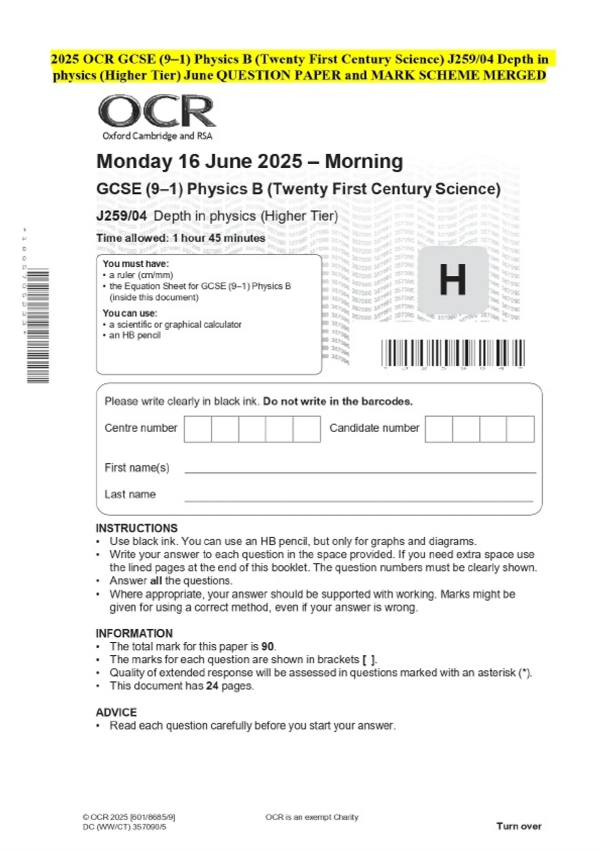 2025 OCR GCSE (9–1) Physics B (Twenty First Century Science) J259/04 Depth in physics (Higher Tier) June QUESTION PAPER and MARK SCHEME MERGED