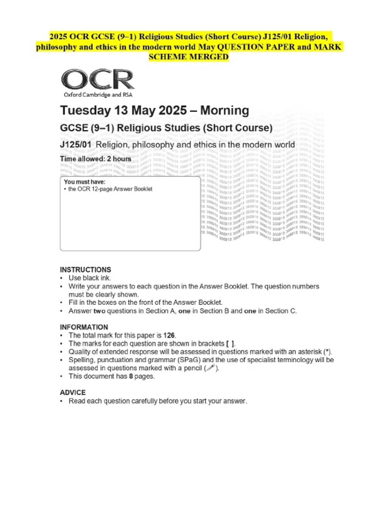 2025 OCR GCSE (9–1) Religious Studies (Short Course) J125/01 Religion, philosophy and ethics in the modern world May QUESTION PAPER and MARK SCHEME MERGED