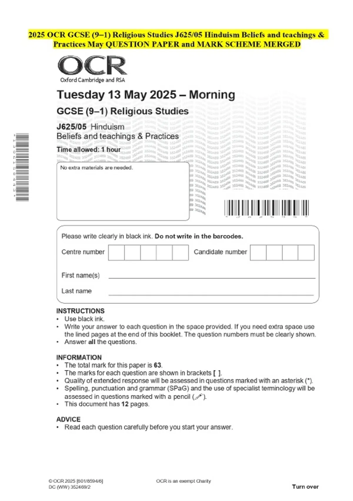 2025 OCR GCSE (9–1) Religious Studies J625/05 Hinduism Beliefs and teachings & Practices May QUESTION PAPER and MARK SCHEME MERGED