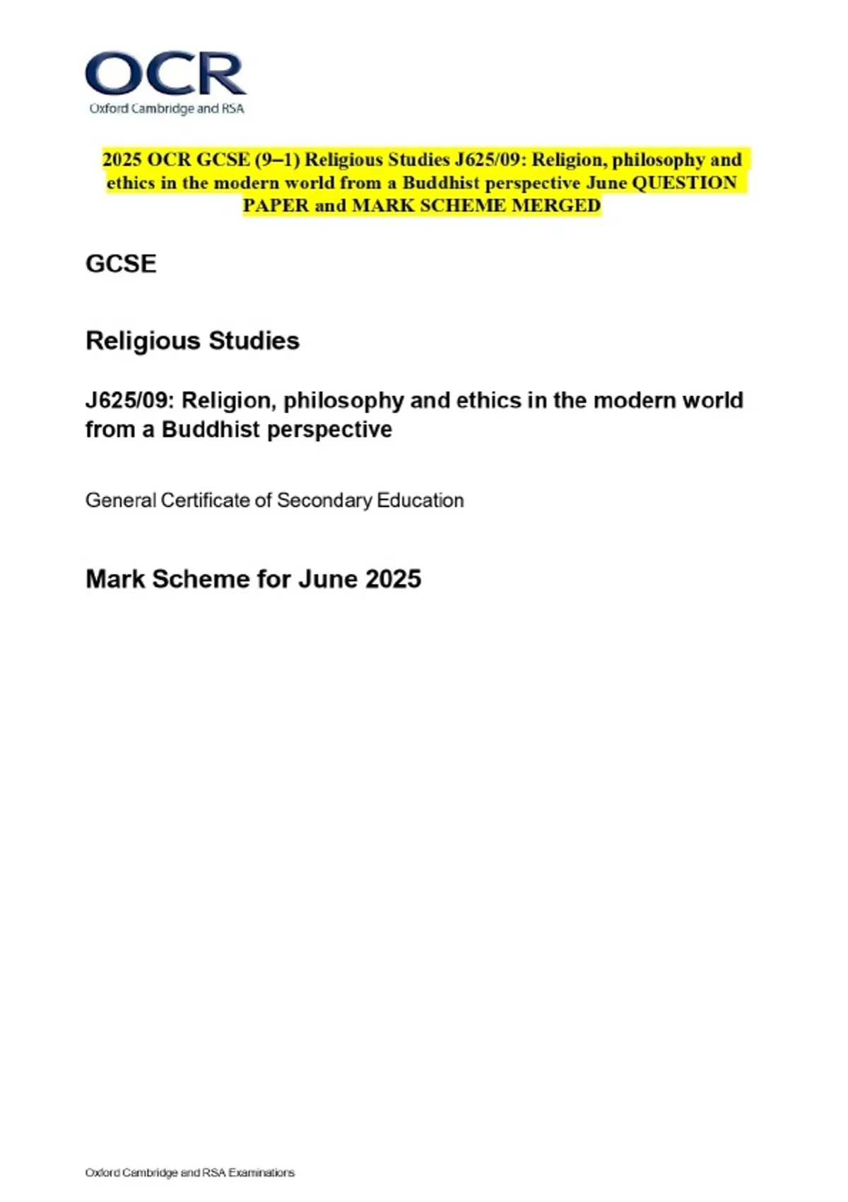 2025 OCR GCSE (9–1) Religious Studies J625/09: Religion, philosophy and ethics in the modern world from a Buddhist perspective June QUESTION PAPER and MARK SCHEME MERGED
