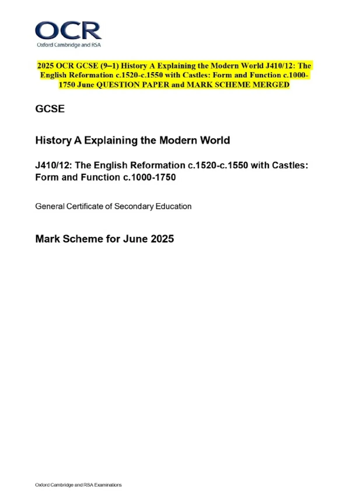 2025 OCR GCSE (9–1) History A Explaining the Modern World J410/12: The English Reformation c.1520-c.1550 with Castles: Form and Function c. June QUESTION PAPER and MARK SCHEME MERGED