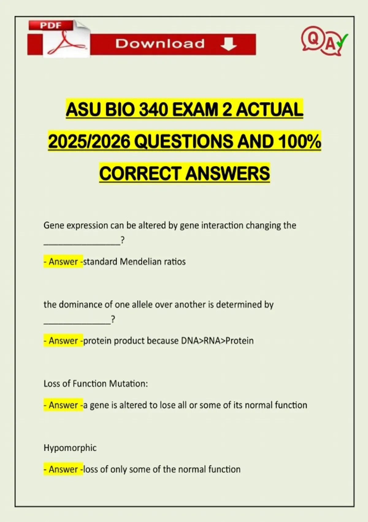ASU BIO 340 EXAM 2 ACTUAL 2025/2026 QUESTIONS AND 100% CORRECT ANSWERS Gene expression can be altered by gene interaction changing the ________________? - Answer -standard Mendelian ratios the dominance of one allele over another is determined by ______________?