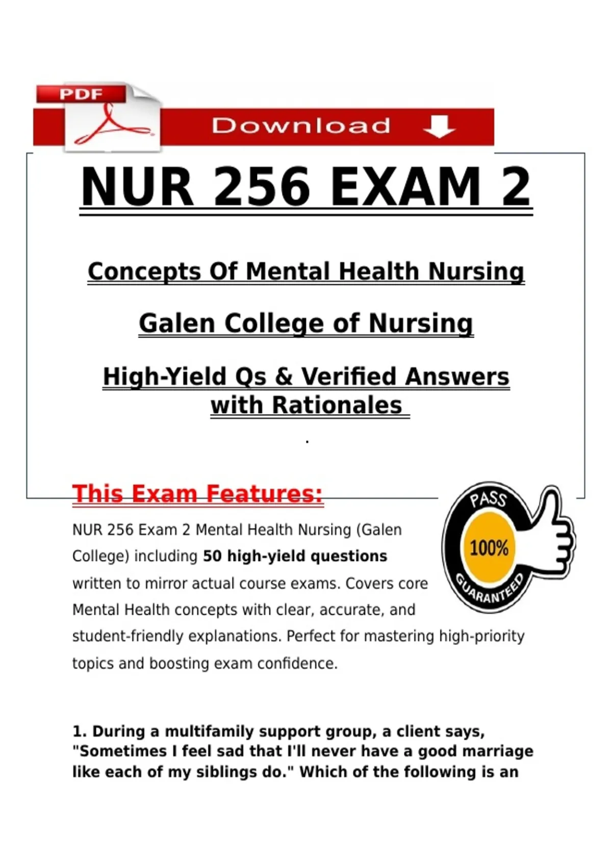 NUR 256 Exam 2 Mental Health Nursing (Galen