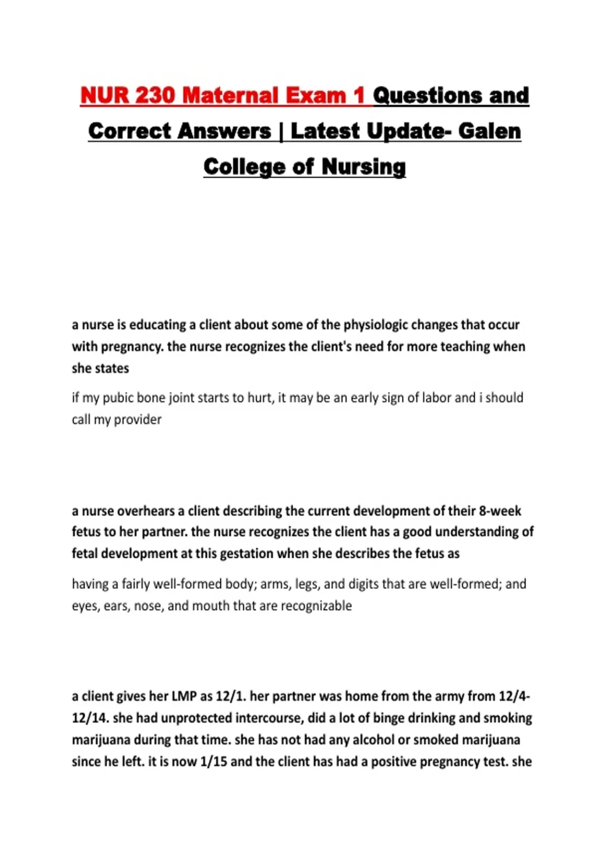 NUR 230 Maternal Exam 1 Questions and Correct Answers | Latest Update- Galen College of Nursing