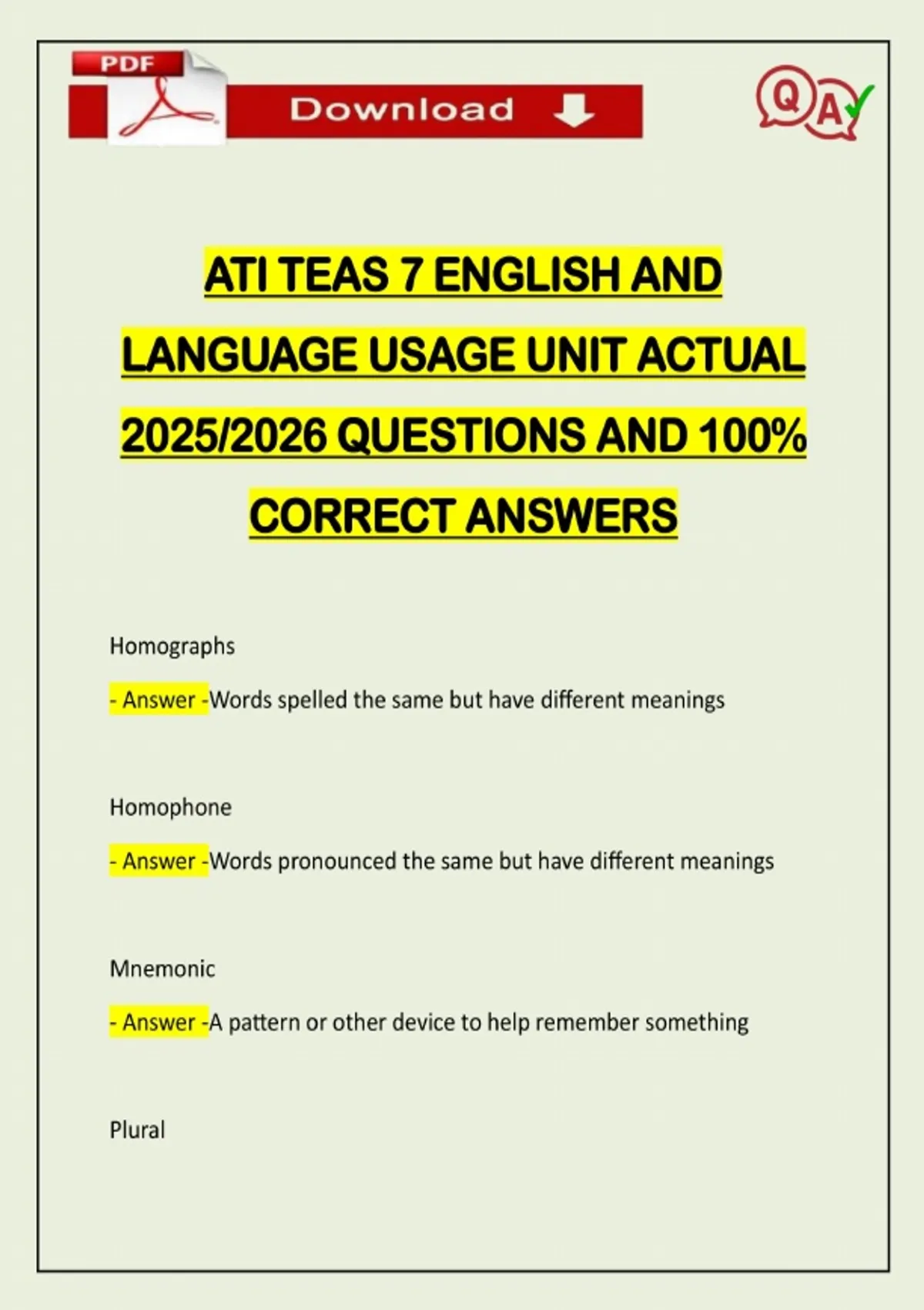 ATI TEAS 7 ENGLISH AND LANGUAGE USAGE UNIT ACTUAL 2025/2026 QUESTIONS AND 100% CORRECT ANSWERS Homographs - Answer -Words spelled the same but have different meanings Homophone - Answer -Words pronounced the same but have different meanings Mnemonic - Answer -A pattern or other device to help remember something Plural