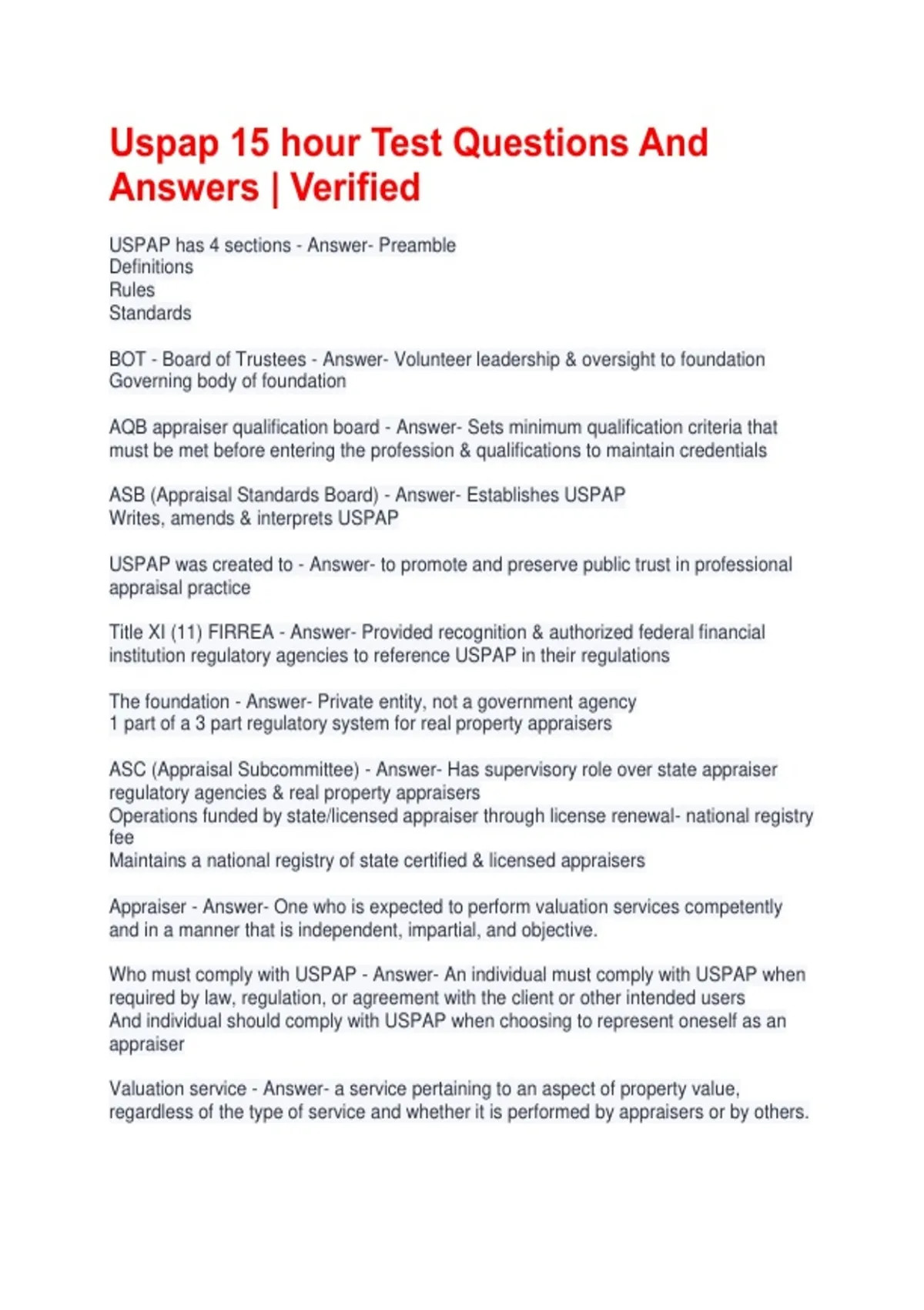 Uspap 15 hour Test Questions And Answers | Verified USPAP has 4 sections - Answer- Preamble Definitions Rules Standards BOT - Board of Trustees - Answer- Volunteer leadership & oversight to foundation Governing body of foundation AQB appraiser qualification board - Answer- Sets minimum qualification criteria that must be met before entering the profession & qualifications to maintain credentials ASB (Appraisal Standards Board) - Answer- Establishes USPAP Writes, amends & interprets USPAP USPAP was created to - Answer- to promote and preserve public trust in professional appraisal practice Title XI (11) FIRREA - Answer- Provided recognition & authorized federal financial institution regulatory agencies to reference USPAP in their regulations The foundation - Answer- Private entity, not a government agency 1 part of a 3 part regulatory system for real property appraisers ASC (Appraisal Subcommittee) - Answer- Has supervisory role over state appraiser regulatory agencies & real property appraisers Operations funded by state/licensed appraiser through license renewal- national registry fee Maintains a national registry of state certified & licensed appraisers Appraiser - Answer- One who is expected to perform valuation services competently and in a manner that is independent, impartial, and objective. Who must comply with USPAP - Answer- An individual must comply with USPAP when required by law, regulation, or agreement with the client or other intended users And individual should comply with USPAP when choosing to represent oneself as an appraiser Valuation service - Answer- a service pertaining to an aspect of property value, regardless of the type of service and whether it is performed by appraisers or by others. Appraisal Practice - Answer- Valuation services performed by an individual acting as an appraiser, including but not limited to appraisal and appraisal review. Other services provided by an appraiser & within appraisal practice might include - Answer- Teaching appraisal courses Performing a feasibility study Writing an appraisal article Performing a market study User expectations - Answer- Identify the capacity in which she is performing & inquire about the intended users expections When performing services outside appraisal practice, do not misrepresent yourself Can choose to provide a valuation service as an appraiser or in some other capacity, but must not violate public trust Ethics Rule - Answer- A USPAP rule that requires appraisers to avoid actions that could be considered misleading or fraudulent An appraiser must promote and preserve public trust inherent in professional appraisal practice by observing the highest standards of professional ethics a law or regulation - Answer- Appraisers must comply with requirements of USPAP when obligated by law or regulation Bias - Answer- A preference or precludes an appraisers impartiality, independent or objectivity assumption - Answer- Something that is taken to be true Extraordinary Assumption - Answer- an assignment-specific assumption as of the effective date regarding uncertain information used in an analysis which, if found to be false, could alter the appraiser's opinions or conclusions. Hypothetical Condition - Answer- a condition, directly related to a specific assignment, which is contrary to what is known by the appraiser to exist on the effective date of the assignment results, but is used for the purpose of analysis. (What if) Exposure time - Answer- an opinion, based on supporting market data, of the length of time that the property interest being appraised would have been offered on the market prior to the hypothetical consummation of a sale at market value on the effective date of the appraisal. cost - Answer- The actual or estimated amount required to create, reproduce, replace or obtain a property Is a fact Price - Answer- the amount asked, offered, or paid for a property Becomes a fact once stated Value - Answer- The monetary relationship between properties and those who buy sell or use those properties expressed as an opinion client - Answer- The party or parties who engage an appraiser by employment or contract in a specific assignment whether directly or through an agent Assignment conditions include: - Answer- Assumptions, extraordinary assumptions, hypothetical conditions, laws and regulations, jurisdictional exceptions, and other conditions that affect the scope of work. assignment - Answer- A valuation service that is provided by an appraiser as a consequence of an agreement with a client. Assignment Results - Answer- An appraiser's opinions or conclusions, not limited to value, that were developed when performing an appraisal assignment, an appraisal review assignment, or a valuation service other than an appraisal or appraisal review. confidential information - Answer- identified by the client as confidential when providing it to an appraiser and that is not available from any other source; or classified as confidential or private by applicable law or regulation. Record keeping rule - Answer- An appraiser must prepare a workfile for each appraisal or appraisal review assignment. A workfile must be in existence prior to the issuance of any report. A written summary of an oral report must be added to the workfile within a reasonable time after the issuance of the oral report The contents of a work file - Answer- The name of the client and the identity by name or type of any other intended users True copies of all written reports Summaries of all oral reports or testimony-including the appraisers signed and dated certification All other data information and documentation to support the opinions and conclusions and to show compliance with USPAP Retaining the work file - Answer- At least 5 years after preparation or at least 2 years after final disposition if any judicial proceeding in which the appraiser provided testimony (which very rarely happens) USPAP says these are minimums Work file access - Answer- A 