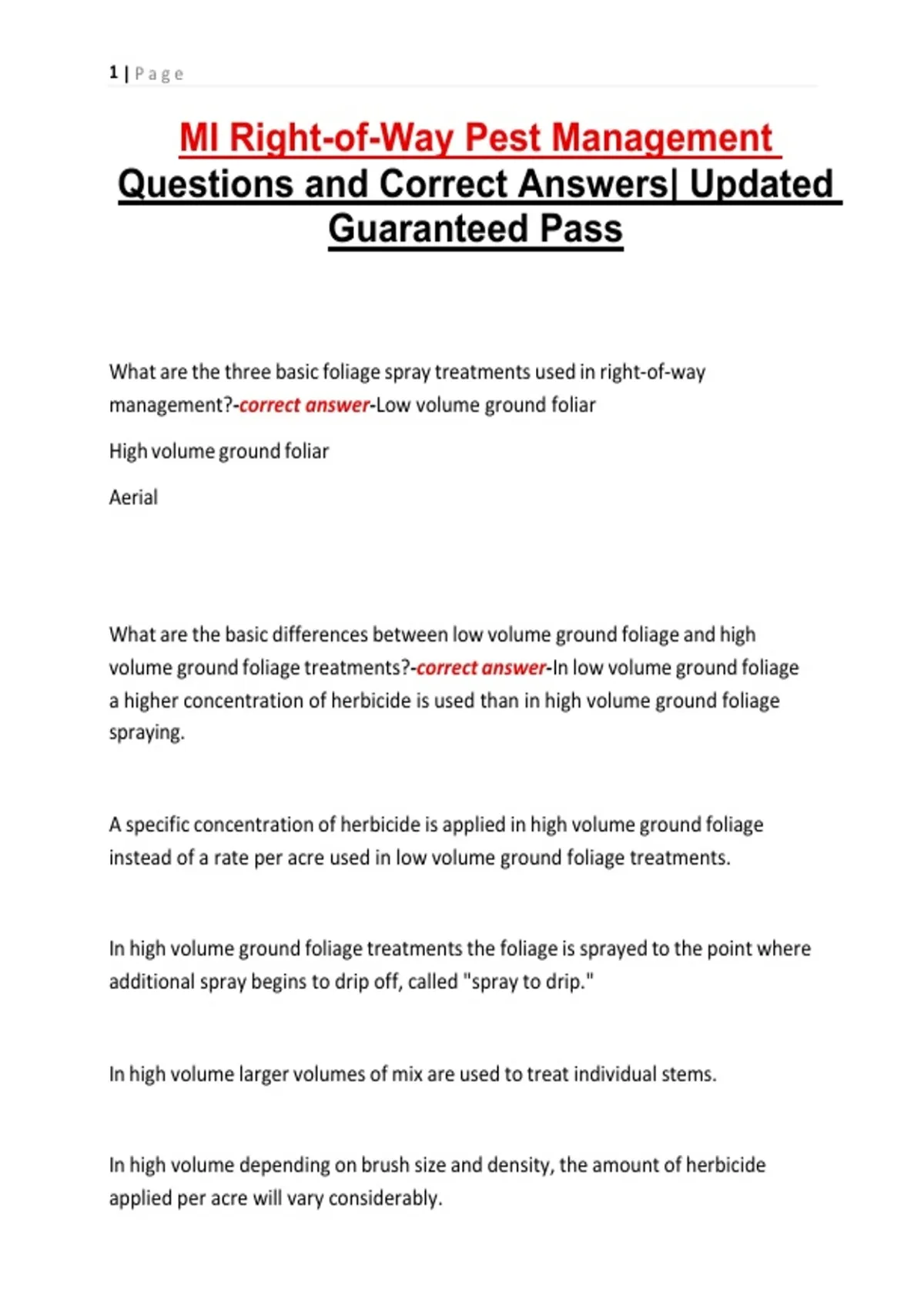 This document contains a comprehensive set of practice questions with verified correct answers for Michigan Right-of-Way Pest Management. It covers herbicide application methods, equipment calibration, pest identification, growth regulators, integrated pest management (IPM), environmental protection, and public relations relevant to rights-of-way. The material is well suited for exam preparation and review, reflecting topics commonly tested for Michigan pesticide applicator certification and recertification.