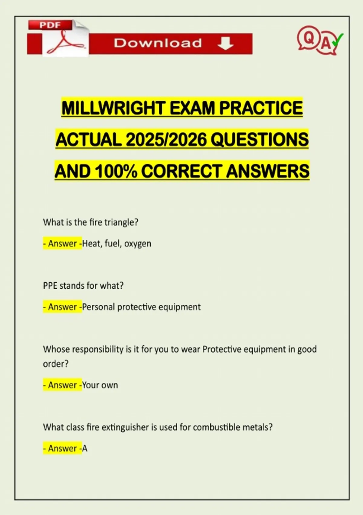 MILLWRIGHT EXAM PRACTICE ACTUAL 2025/2026 QUESTIONS AND 100% CORRECT ANSWERS What is the fire triangle? - Answer -Heat, fuel, oxygen PPE stands for what? - Answer -Personal protective equipment Whose responsibility is it for