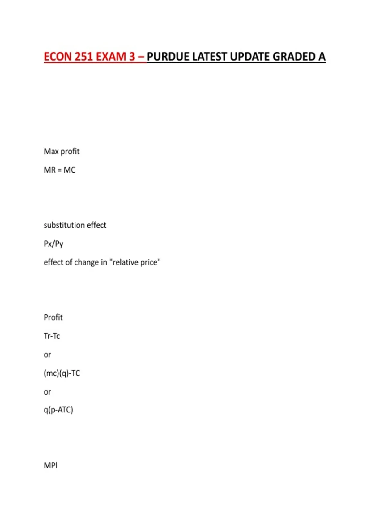 This document provides a concise overview of essential concepts, formulas, and definitions for ECON 251 Exam 3 at Purdue University. It covers profit maximization, cost structures, utility maximization, elasticity-related effects, production theory, and market efficiency conditions. The material is ideal as a study guide, summarizing core microeconomic relationships frequently tested on exams.