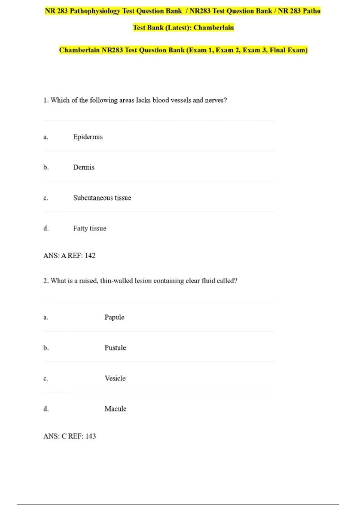 NR 283 Pathophysiology Test Question Bank / NR283 Test Question Bank / NR 283 Patho Test Bank (Latest): Chamberlain Chamberlain NR283 Test Question Bank (Exam 1, Exam 2, Exam 3, Final Exam)