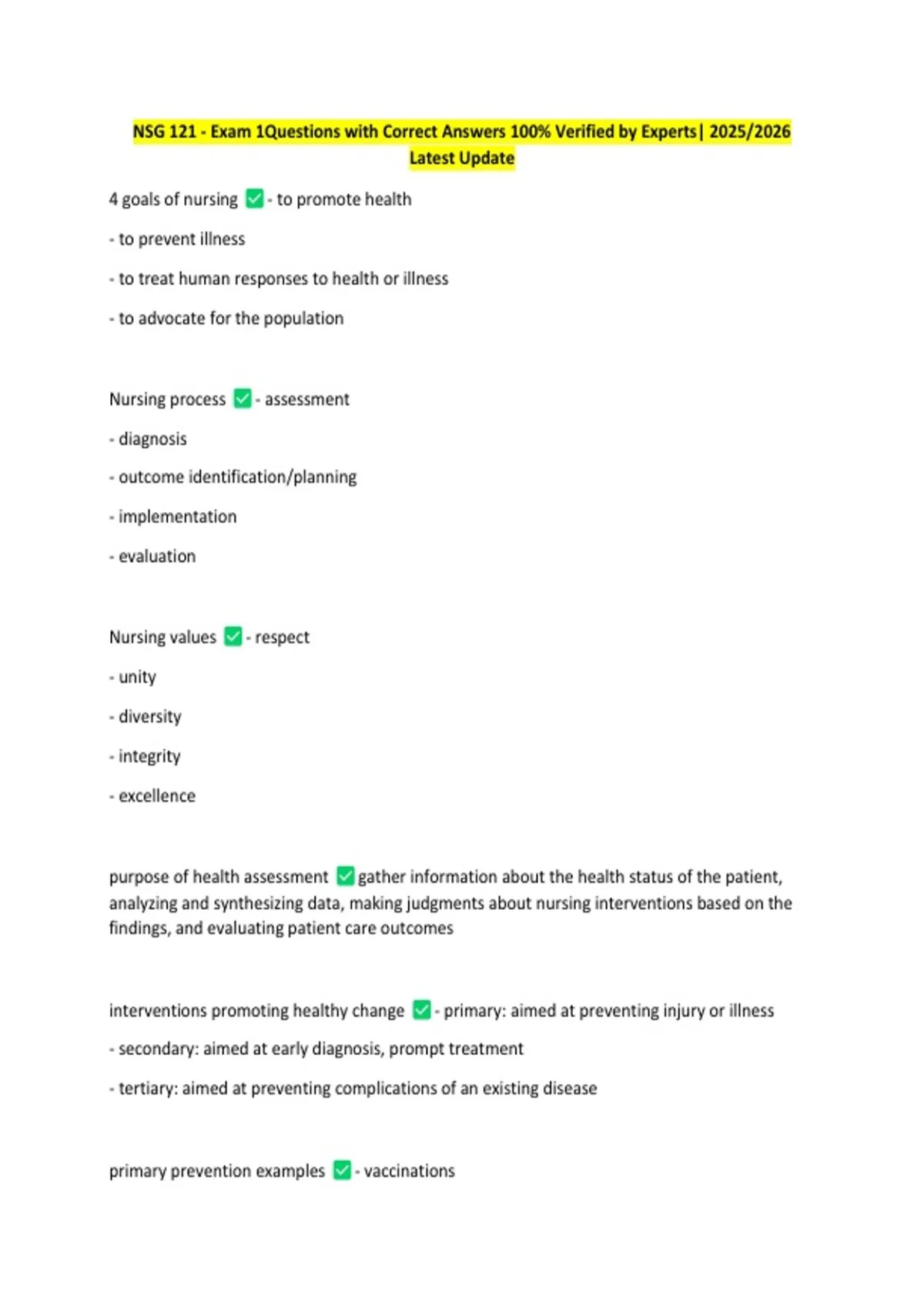 NSG 121 - Exam 1Questions with Correct Answers 100% Verified by Experts| 2025/2026