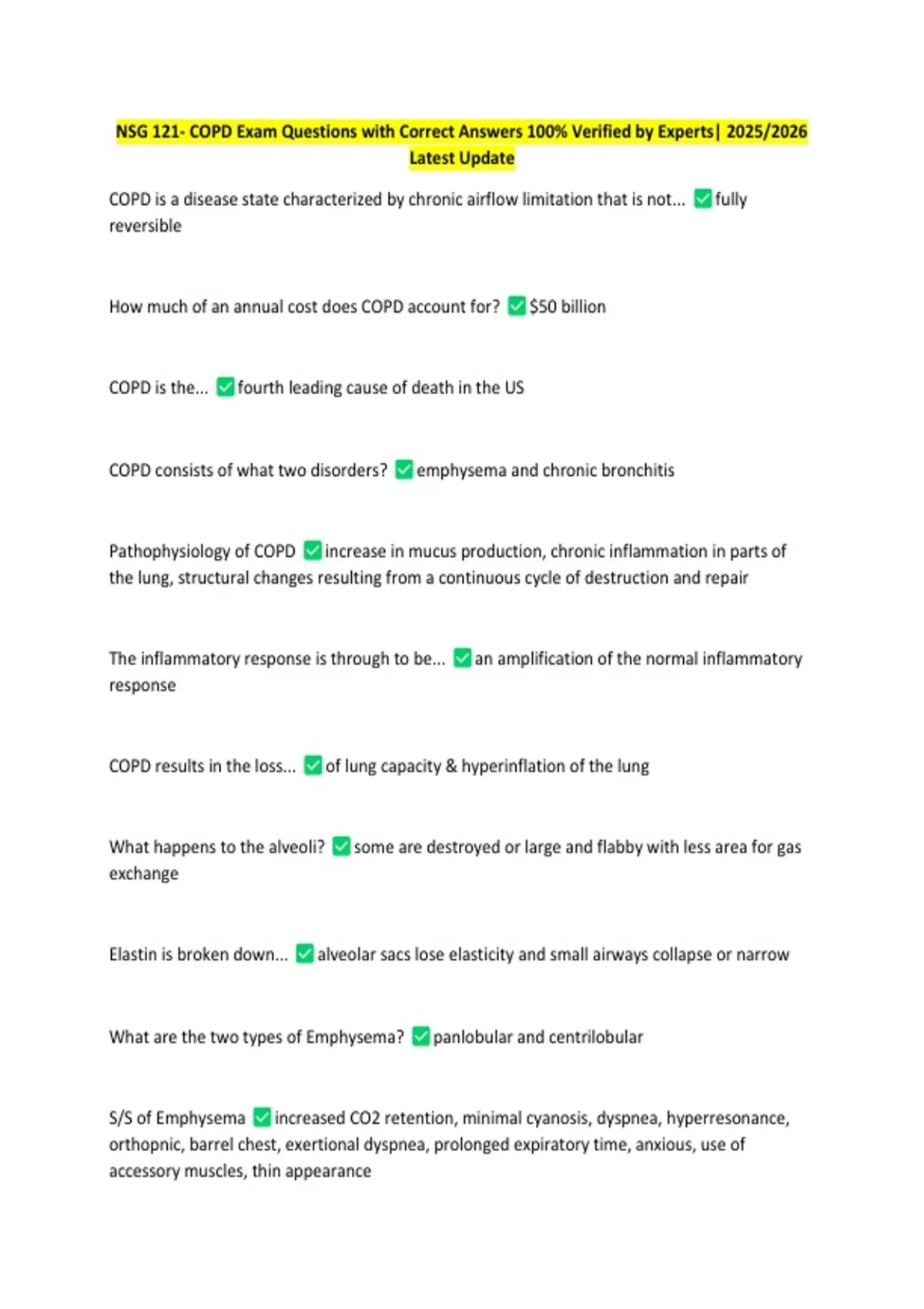 NSG 121- COPD Exam Questions with Correct Answers 100% Verified by Experts| 2025/2026