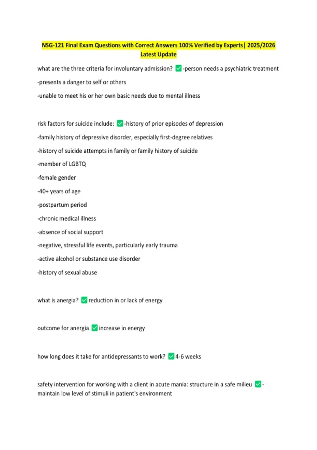 NSG-121 Final Exam Questions with Correct Answers 100% Verified by Experts| 2025/2026