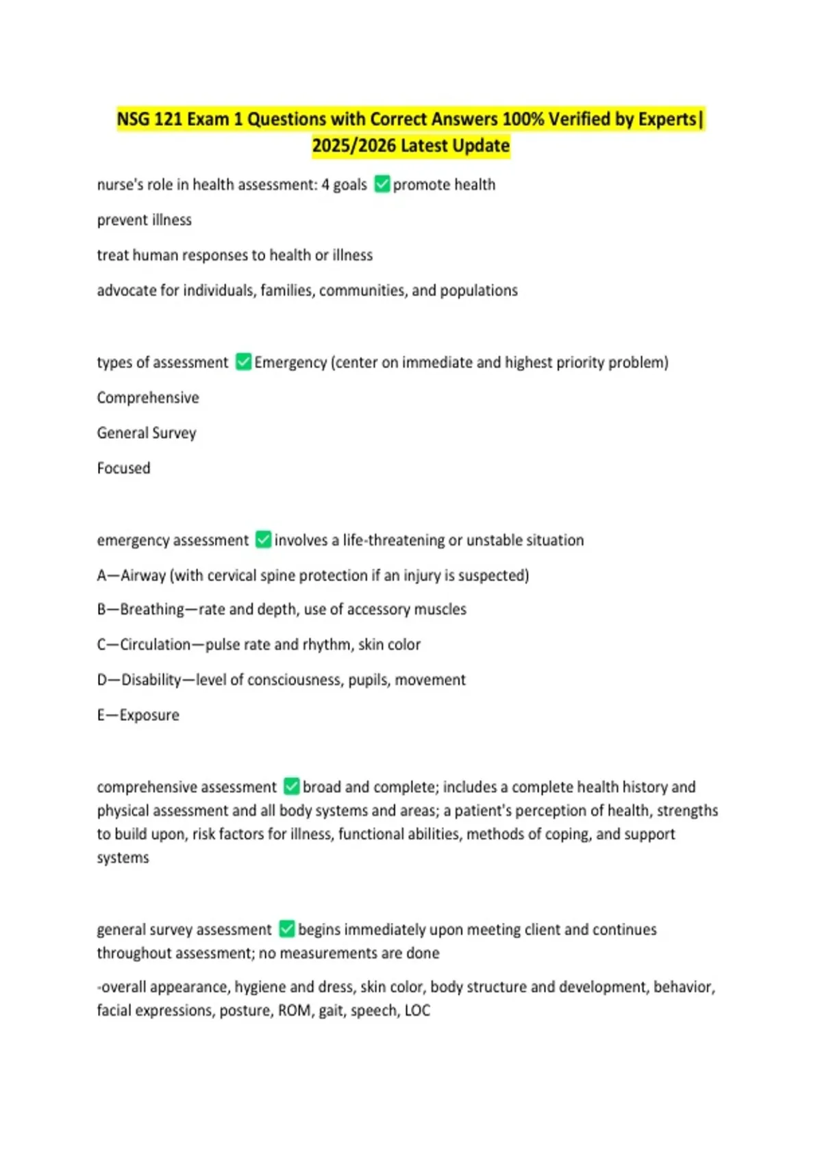 NSG 121 Exam 1 Questions with Correct Answers 100% Verified by Experts|