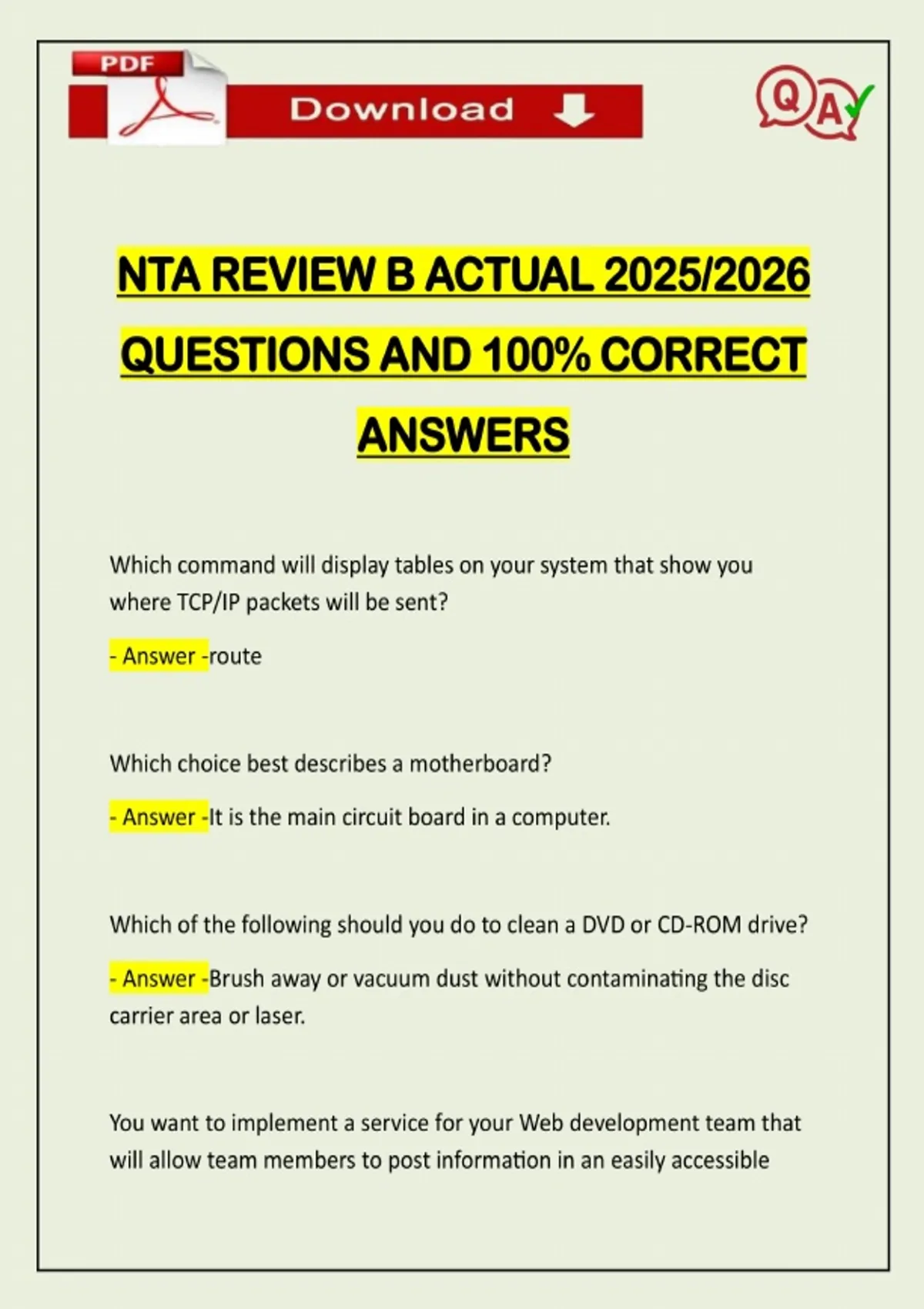 NTA REVIEW B ACTUAL 2025/2026 QUESTIONS AND 100% CORRECT ANSWERS Which command will display tables on your system that show you where TCP/IP packets will be sent? - Answer -route Which choice best describes a motherboard? - Answer -It is the main circuit board in a computer. Which of the following should you do to clean a DVD or CD-ROM drive? - Answer -Brush away or vacuum dust without contaminating the disc carrier area or laser. You want to implement a service f