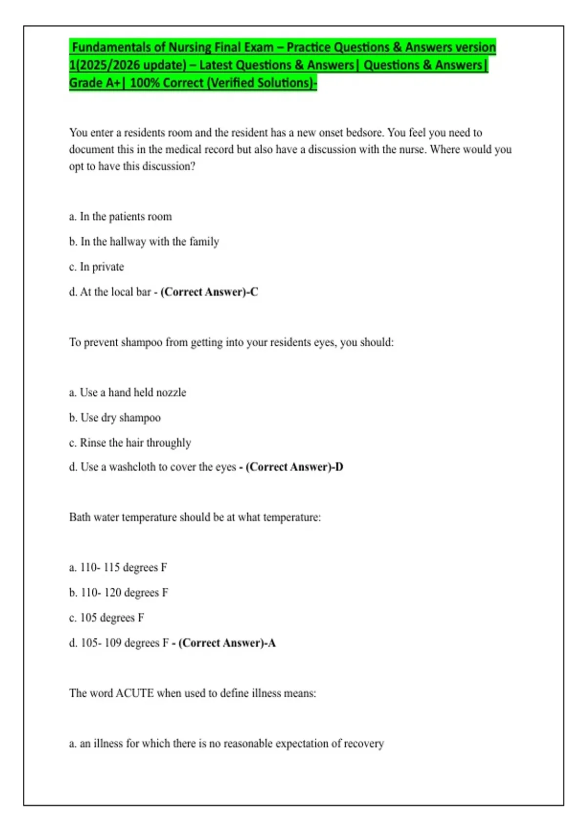Fundamentals of Nursing Final Exam – Practice Questions & Answers version
