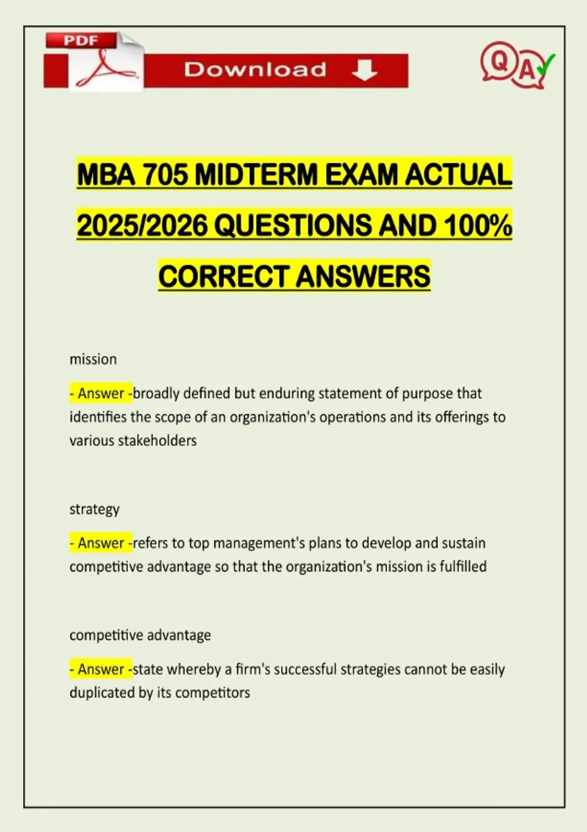 MBA 705 MIDTERM EXAM ACTUAL 2025/2026 QUESTIONS AND 100% CORRECT ANSWERS mission - Answer -broadly defined but enduring statement of purpose that identifies the scope of an organization's operations and its offerings to various stakeholders strategy - Answer -refers to top management's plans to develop and sustain competitive advantage so that the organization's mission is fulfilled competitive advantage - Answer -state whereby a firm's successful strategies cannot be easily duplicated by its competitors