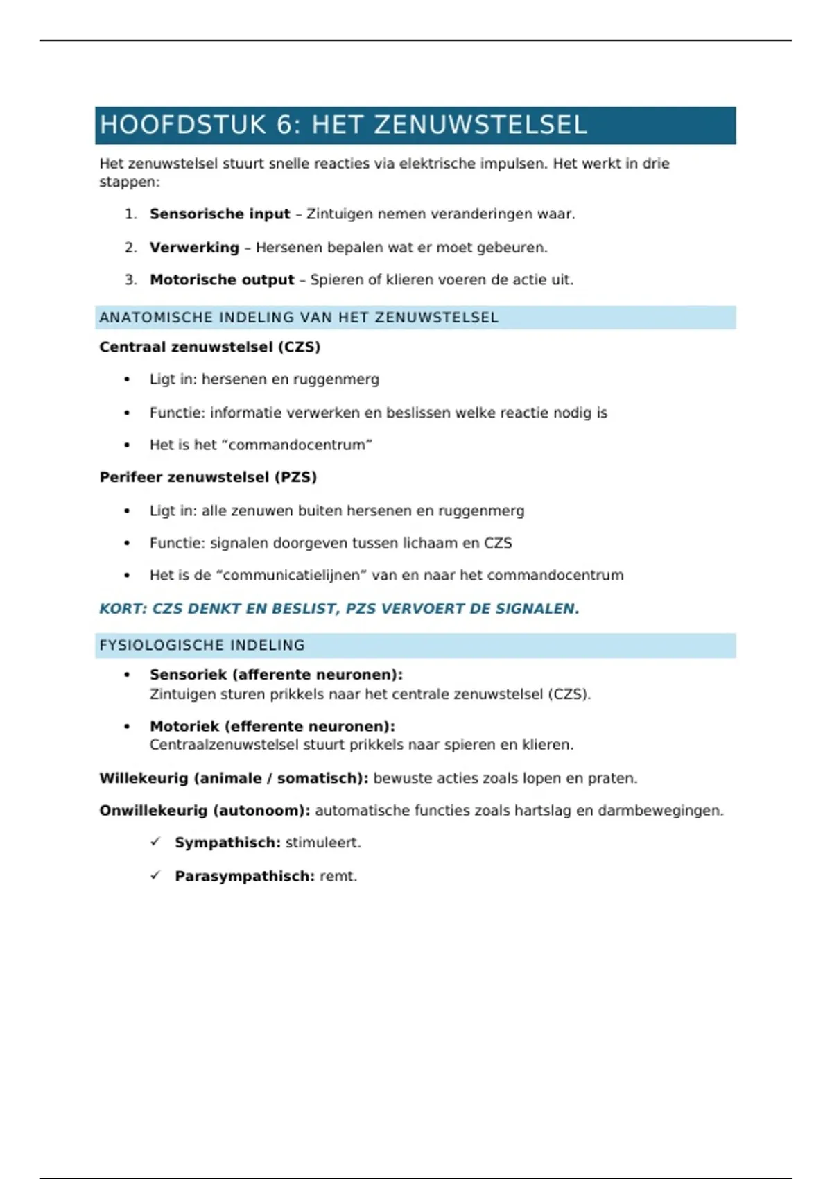 Centraalzenuwstelsel stuurt prikkels naar spieren en klieren.