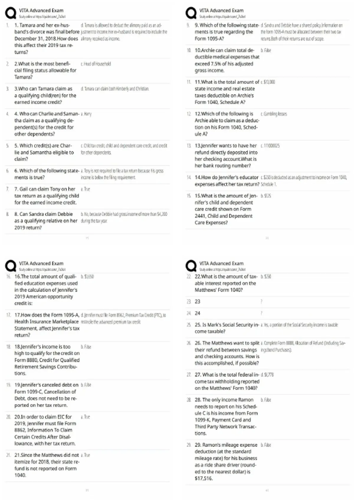 Complete VITA Advanced Exam questions and correct answers covering complex IRS tax law topics tested in the Volunteer Income Tax Assistance Advanced certification. Ideal for exam prep, quizzes, test banks, and assignments to help candidates pass confidently and score 100%.