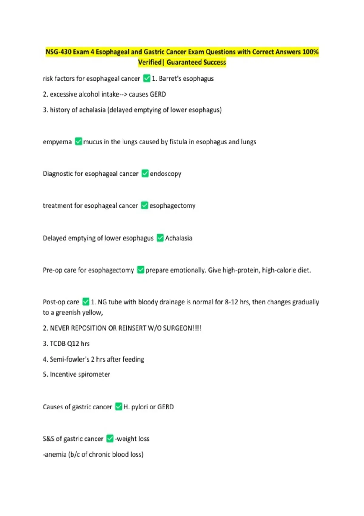 NSG-430 Exam 4 Esophageal and Gastric Cancer Exam Questions with Correct Answers 100%