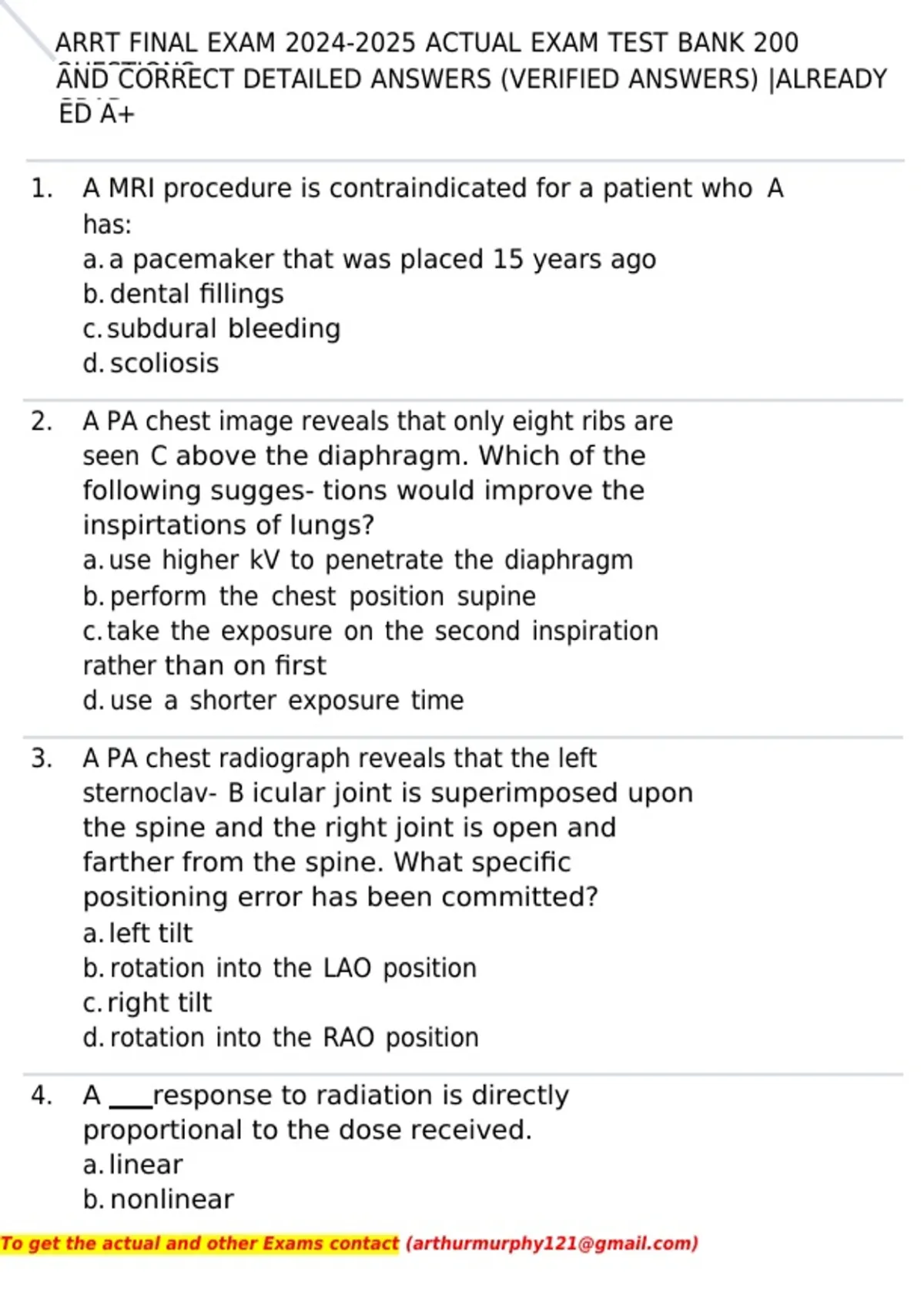 , ARRT FINAL EXAM 2024-2025 ACTUAL EXAM TEST BANK 200