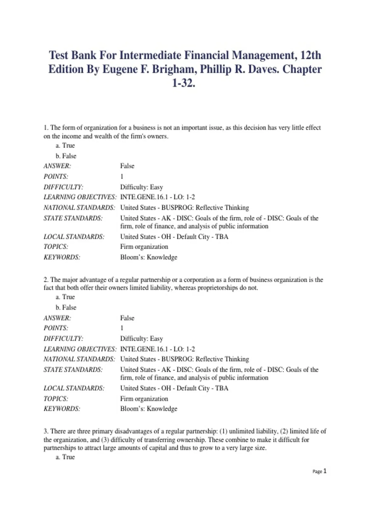 Test Bank – Intermediate Financial Management (12th Edition) by Eugene F. Brigham & Phillip R. Daves | Chapters 1–32