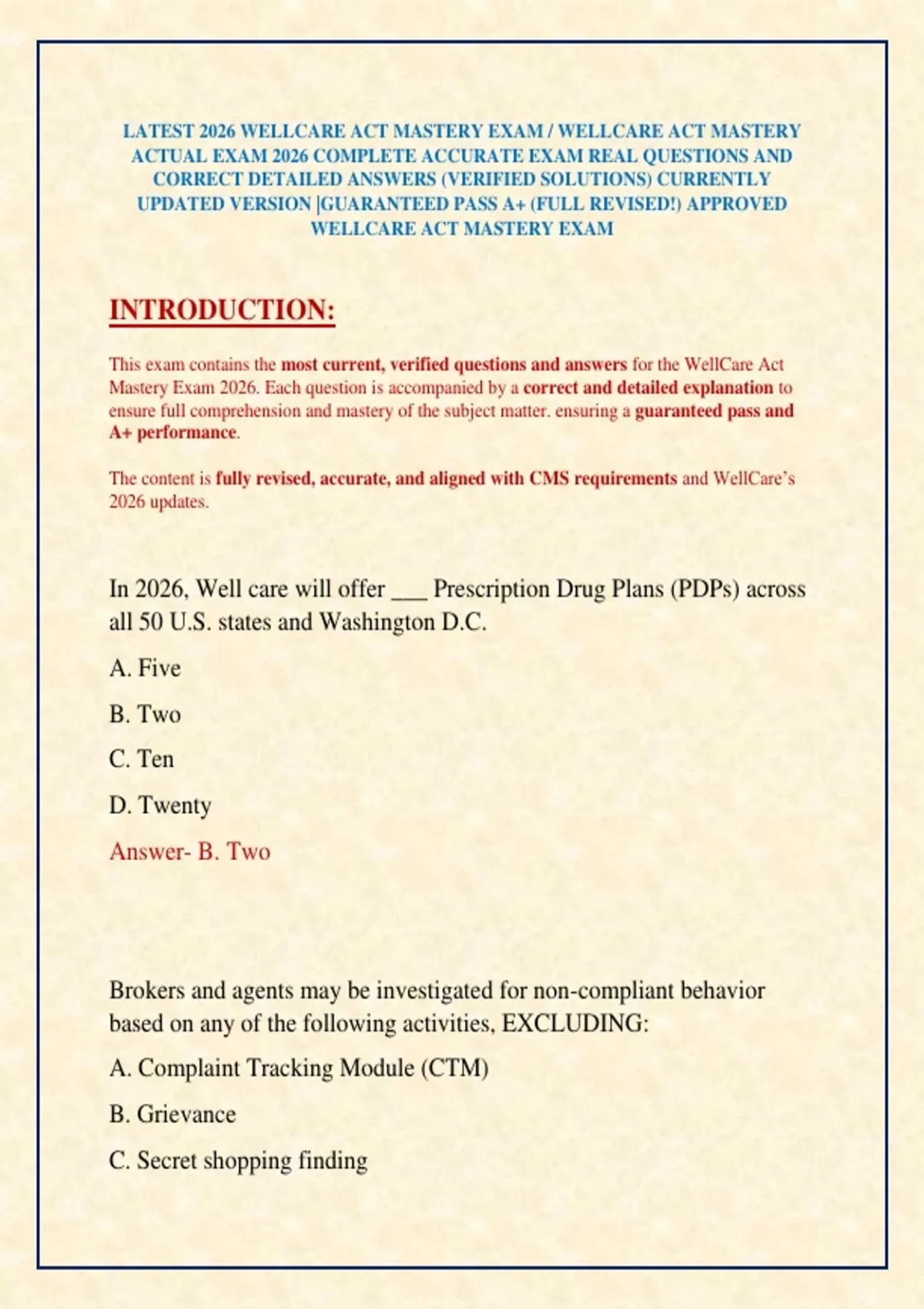 This exam contains the most current, verified questions and answers for the WellCare Act Mastery Exam 2026. Each question is accompanied by a correct and detailed explanation to ensure full comprehension and mastery of the subject matter. ensuring a guaranteed pass and A+ performance. The content is fully revised, accurate, and aligned with CMS requirements and WellCare’s 2026 updates.