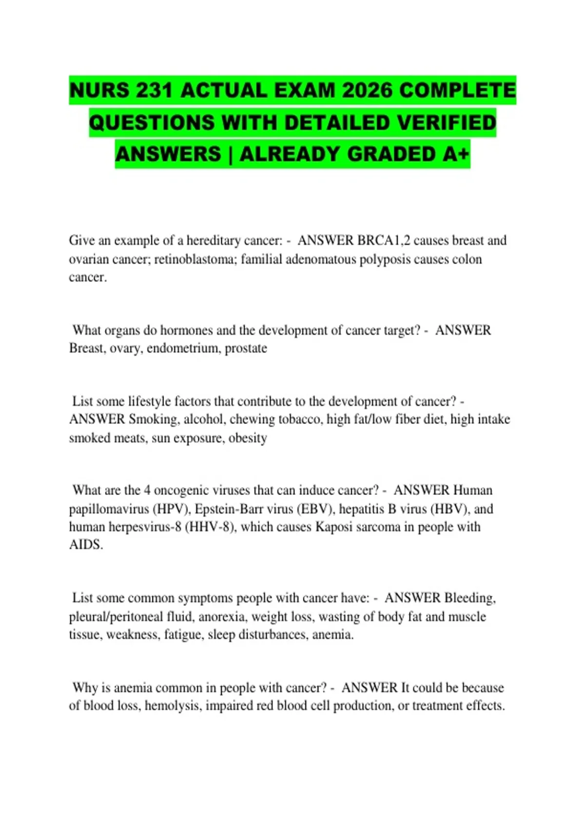 NURS 231 ACTUAL EXAM 2026 COMPLETE QUESTIONS WITH DETAILED VERIFIED ANSWERS | ALREADY GRADED A+ Give an example of a hereditary cancer: - ANSWER BRCA1,2 causes breast and ovarian cancer; retinoblastoma; familial adenomatous polyposis causes colon cancer. What organs do hormones and the development of cancer target? - ANSWER Breast, ovary, endometrium, prostate List some lifestyle factors that contribute to the development of cancer? - ANSWER Smoking, alcohol, chewing tobacco, high fat/low fiber diet, high intake smoked meats, sun exposure, obesity What are the 4 oncogenic viruses that can induce cancer? - ANSWER Human papillomavirus (HPV), Epstein-Barr virus (EBV), hepatitis B virus (HBV), and human herpesvirus-8 (HHV-8), which causes Kaposi sarcoma in people with AIDS. List some common symptoms people with cancer have: - ANSWER Bleeding, pleural/peritoneal fluid, anorexia, weight loss, wasting of body fat and muscle tissue, weakness, fatigue, sleep disturbances, anemia. Why is anemia common in people with cancer? - ANSWER It could be because of blood loss, hemolysis, impaired red blood cell production, or treatment effects. What are paraneoplastic syndromes? Give an example. - ANSWER Cancer can also produce symptoms in sites not directly affected by the disease. These manifestations are termed paraneoplastic syndromes. Examples are syndrome of inappropriate ADH secretion, Cushing syndrome due to ectopic ACTH production, and hypercalcemia. What body parts do we screen through observation? Palpation? Laboratory tests and procedures? - ANSWER Observation (skin, mouth, external genitalia), palpation (breast, thyroid, rectum and anus, prostate, lymph nodes), and laboratory tests and procedures (Pap smear, colonoscopy, mammography) What are tumor markers helpful for? - ANSWER Establishing prognosis, monitoring treatment, and detecting recurrent disease. What is the most important procedure in diagnosing the correct cancer and histology? - ANSWER Tissue biopsy Define grading and staging and be familiar with table 2.5. - ANSWER Grading is the histologic or cellular characteristics of the tumor. Staging is the clinical spread of the disease. What is the purpose of grading and staging a tumor? - ANSWER Both methods are used to determine the course of the disease and aid in selecting an appropriate treatment or management plan. What are the 3 possible goals of cancer treatment? - ANSWER Curative, control, and palliative When is surgery appropriate in the treatment of cancer? - ANSWER If the tumor is small with well-defined margins; to treat oncologic emergencies; prophylactically How does radiation kill cancer cells? - ANSWER Radiation therapy uses high energy particles or waves to destroy or damage cancer cells. This leads to the creation of free radicals, which damage cell structures. Radiation can interrupt the cell cycle process, kill cells, or damage DNA in the cells. List some side effects of chemotherapy drugs. - ANSWER Neutropenia (risk for infections), anemia (causing fatigue), and thrombocytopenia (risk for bleeding); anorexia, nausea, and vomiting; alopecia, or hair loss. List the 5 possible treatments for cancer: - ANSWER Surgery, radiation, chemotherapy, hormone therapy, and biotherapy Define neoplasia and neoplasm: - ANSWER Neoplasia is a disorder of altered cell differentiation and growth. Neoplasm is the "new growth." Define proliferation and differentiation: - ANSWER Proliferation, a process of cell division, is an adaptive process for new cell growth to replace old cells or when additional cells are needed. Differentiation is the process in which cells become more specialized with each mitotic division. What are the 3 main groups of cells that proliferate? - ANSWER (1) well differentiated neurons and cells of skeletal and cardiac muscles that rarely divide and reproduce; (2) progenitor or parent cells that continue to divide and reproduce, like blood, skin, and liver cells; (3) undifferentiated stem cells that can enter the cell cycle and produce large number of progenitor cells if needed. What are progenitor cells? - ANSWER The more specialized cells are unable to divide, so these cell populations rely on progenitor or parent cells of the same lineage that have not yet differentiated to the extent that they have lost their ability to divide. They have enough differentiation so the daughter cells are limited to the same cell line, but not quite differentiated enough to prohibit active proliferation. What are the benefits of the stem cell? - ANSWER Stem cells remain dormant until they are needed. When needed, they can divide, produce other stem cells, and carry out the functions of the differentiated cell. Two important properties that stem cells possess are self-renewal and potency. Self-renewal means the stem cell can undergo numerous mitotic divisions while maintaining an undifferentiated state. Potency describes the differentiation potential of stem cells. What is a polyp? - ANSWERA polyp is a growth that projects from a mucosal surface, such as the intestine. A polyp can be benign or malignant. Explain metastasis and how it occurs: - ANSWER The multi-step process of metastasis occurs as follows: a cancer cell must break loose from the primary tumor, invade the surrounding extracellular matrix, gain access to a blood vessel, survive its passage in the bloodstream, emerge at a favorable location, invade the surrounding tissue, begin to grow, and establish a blood supply. What are the two broad categories of malignant neoplasms? - ANSWER Solid tumors and hematologic cancers Explain what carcinoma in situ is? - ANSWER Carcinoma in situ is a localized preinvasive lesion. These can typically be surgically removed or treated, and recurrence is less likely.