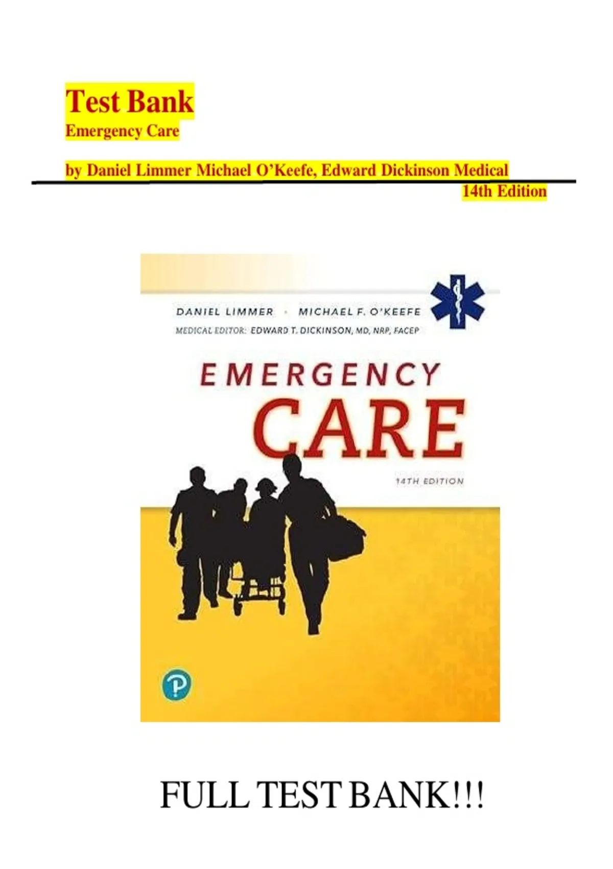 This document provides the complete Test Bank for Emergency Care (14th Edition) by Daniel J. Limmer and co-authors. It includes chapter-by-chapter multiple-choice questions, scenario-based and clinical judgment items, and detailed rationales aligned with current emergency medical services (EMS) standards. Topics cover patient assessment, airway and ventilation, trauma care, medical emergencies, shock, cardiac and respiratory emergencies, obstetrics and pediatrics, pharmacology, EMS operations, and prehospital decision-making. This comprehensive test bank is ideal for exam preparation and instructor assessment support in EMT and emergency care programs.