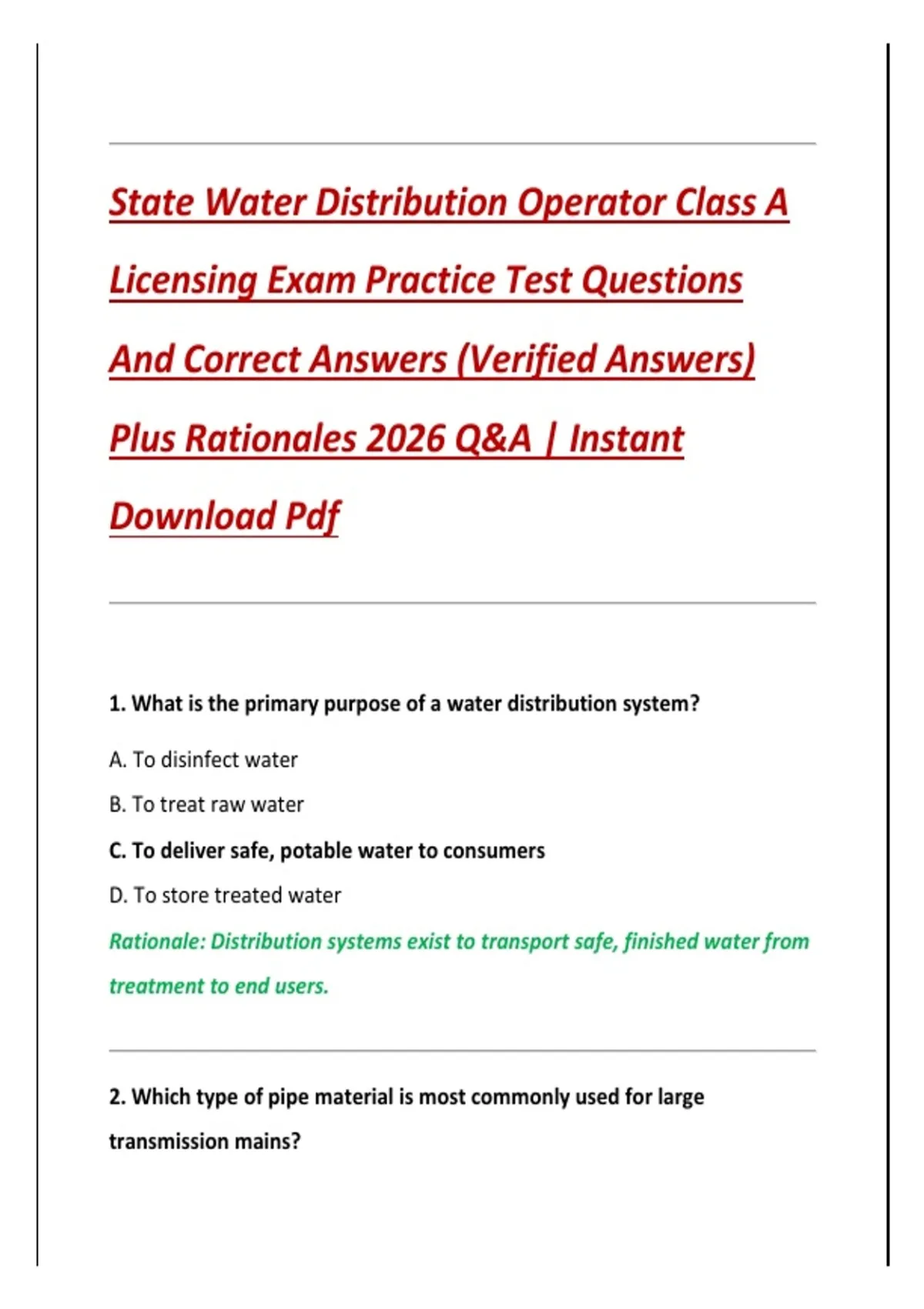 Comprehensive practice test for State Water Distribution Operator Class A licensing exam. Includes questions and verified correct answers to help operators review key water system concepts, reinforce knowledge, and prepare effectively for certification.