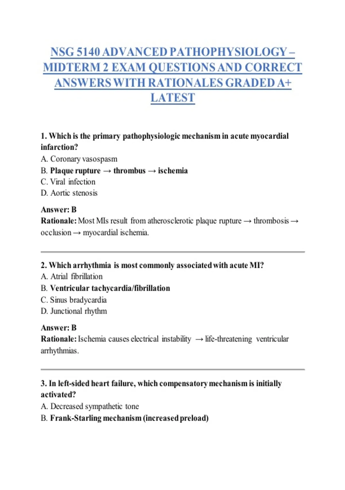 Complete set of NSG 5140 Advanced Pathophysiology Midterm 2 exam questions with verified correct answers. Designed to help graduate nursing students review key pathophysiology concepts, reinforce understanding, and prepare effectively for midterm assessments.